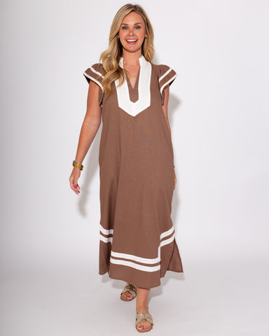 Timeless with a twist, The Classic Contrast Midi in Mocha Mousse is your go-to for effortless elegance. Featuring soft flutter sleeves and a flatte...