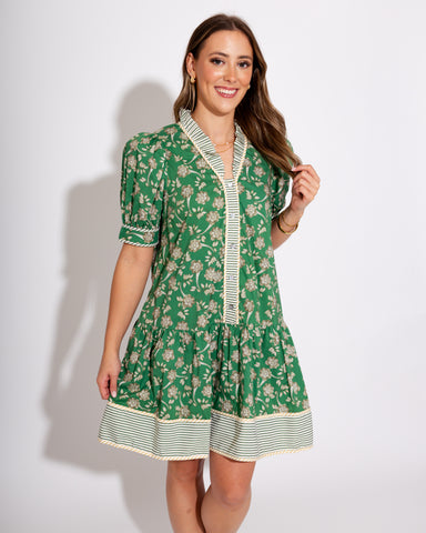 Embrace effortless style with this forest green mini dress, featuring a solid cuff band and charming short puff sleeves. The contrast stitch detail...