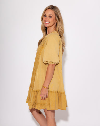 Washed to perfection with a touch of whimsy. This contrast eyelet dress features delicate flutter stitching at the hem, cinched sleeves for a soft ...