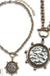 This necklace has a round two-tone old world-look cross pendant. The chain necklace is in a matte finish and has a functional toggle in the front.