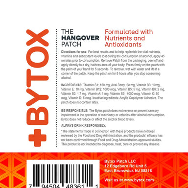 Each resealable package contains 4 Bytox hangover patches. About Bytox: The specially-formulated Bytox hangover patch Pack replenishes the vital l...