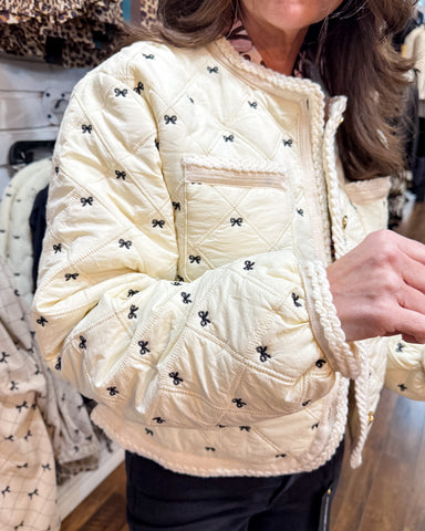 Make a charming statement with this bow embroidered quilted puff jacket, designed to turn heads with its whimsical details. The cream background ad...