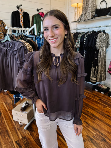 Elevate your wardrobe with this enchanting sheer ruffled blouse that effortlessly blends sophistication with romantic flair. The notched V neckline...