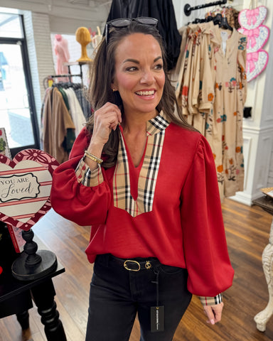 Elevate your wardrobe with the Classic Plaid Accent Top, featuring stylish long puff sleeves and a chic mock neck for a timeless look. The plaid co...
