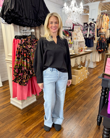 Elevate your everyday wardrobe with this charming ruffle trim button down top. Featuring a striking high ruffled neckline and delicate ruffle detai...