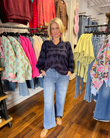 Elevate your everyday wardrobe with this charming Navy Heart Jacquard V-Neck Top. The delicate heart jacquard texture adds visual interest and roma...