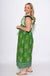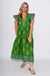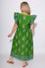 Timeless elegance meets effortless style in this pullover midi dress, set against a rich green background that beautifully showcases a framed floral border in pale blue and light gold hues. Featuring a multicolor band-accented split neckline and graceful flutter sleeves, this dress combines feminine details with practical side pockets. Refined and comfortable, it’s a versatile choice for both polished daytime looks and special occasions.