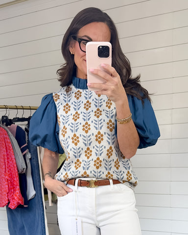 Add a playful retro touch to your wardrobe with this floral knit sweater vest. Featuring a mix of geometric and floral patterns in cheerful shades ...