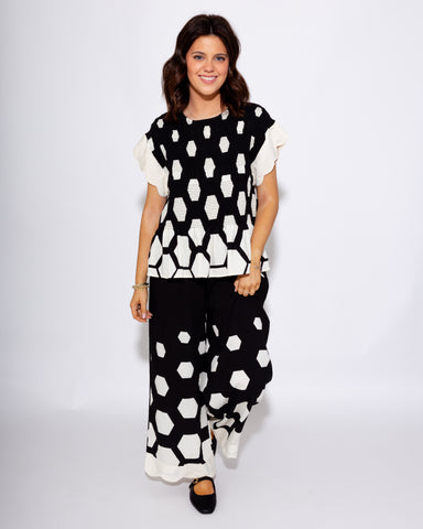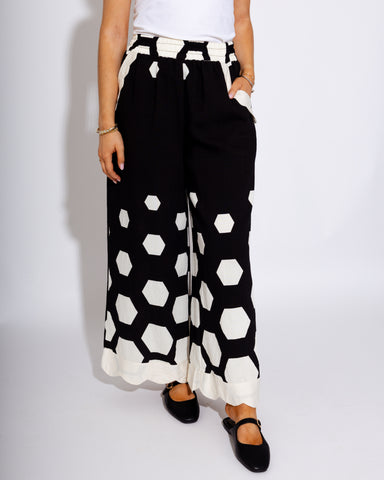 Elevate your casual wardrobe with these black smocked pants featuring a playful scattering hexagon print. The smocked waistband ensures a comfortab...