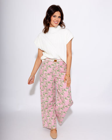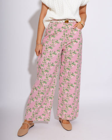 Embrace effortless elegance with these romantic wide-leg pants, featuring a delicate floral print of soft pink and cream roses against a verdant ba...