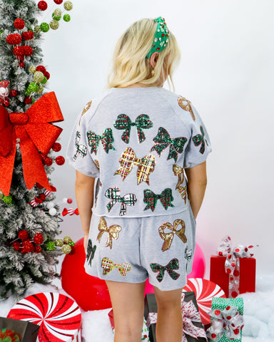 Celebrate the season in style with this grey cropped sweatshirt featuring a festive metallic wreath adorned with a large bow. Vibrant shades of pin...