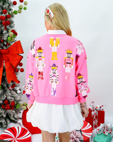 Add a little holiday sparkle to your wardrobe with the Queen of Sparkles Nutcracker & Candy Cane Cardigan 🎄✨. This pink button-up is trimmed wi...