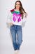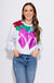 Celebrate the season in style with this grey cropped sweatshirt featuring a festive metallic wreath adorned with a large bow. Vibrant shades of pink, gold, red, green, blue, and purple add a lively touch to your holiday wardrobe. Its cozy fit and eye-catching design make it perfect for spreading cheer while staying comfortable.