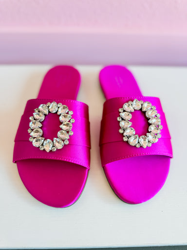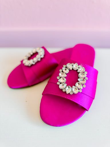 The DIONNE slip-on flat sandals are crafted from glistening satin-effect fabric and feature a striking crystal buckle. Wear yours with denim or dre...