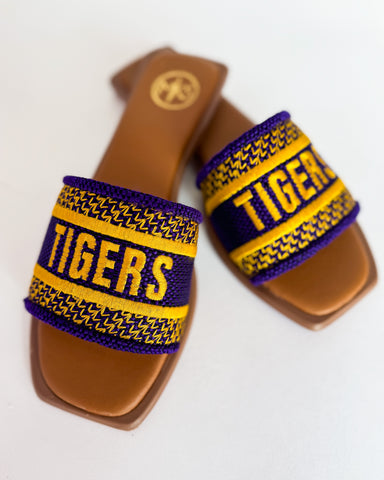 Show your team spirit with the Game Day Tiger Sandal in vibrant purple and gold. This essential sandal features a sleek, slip-on design with a sing...