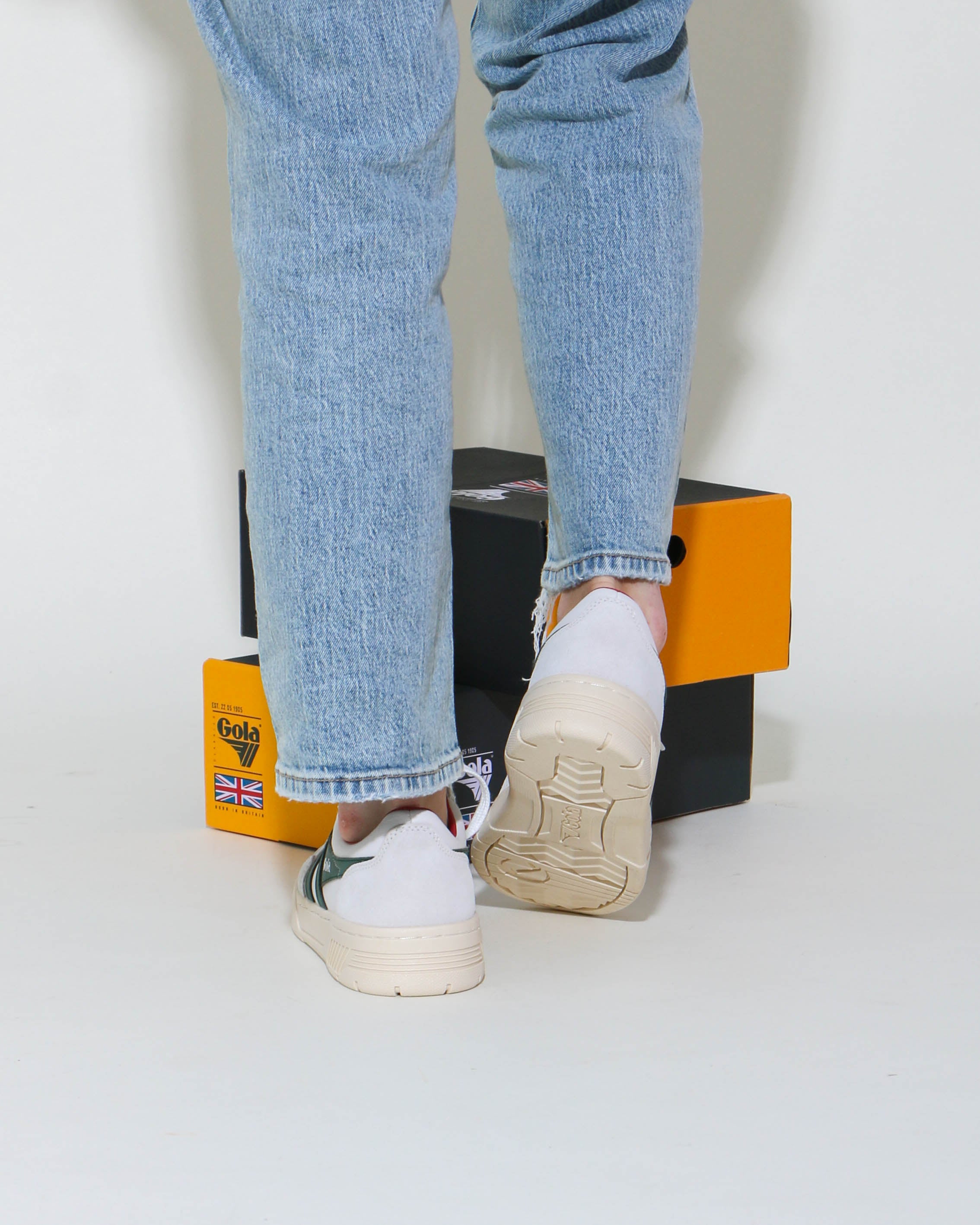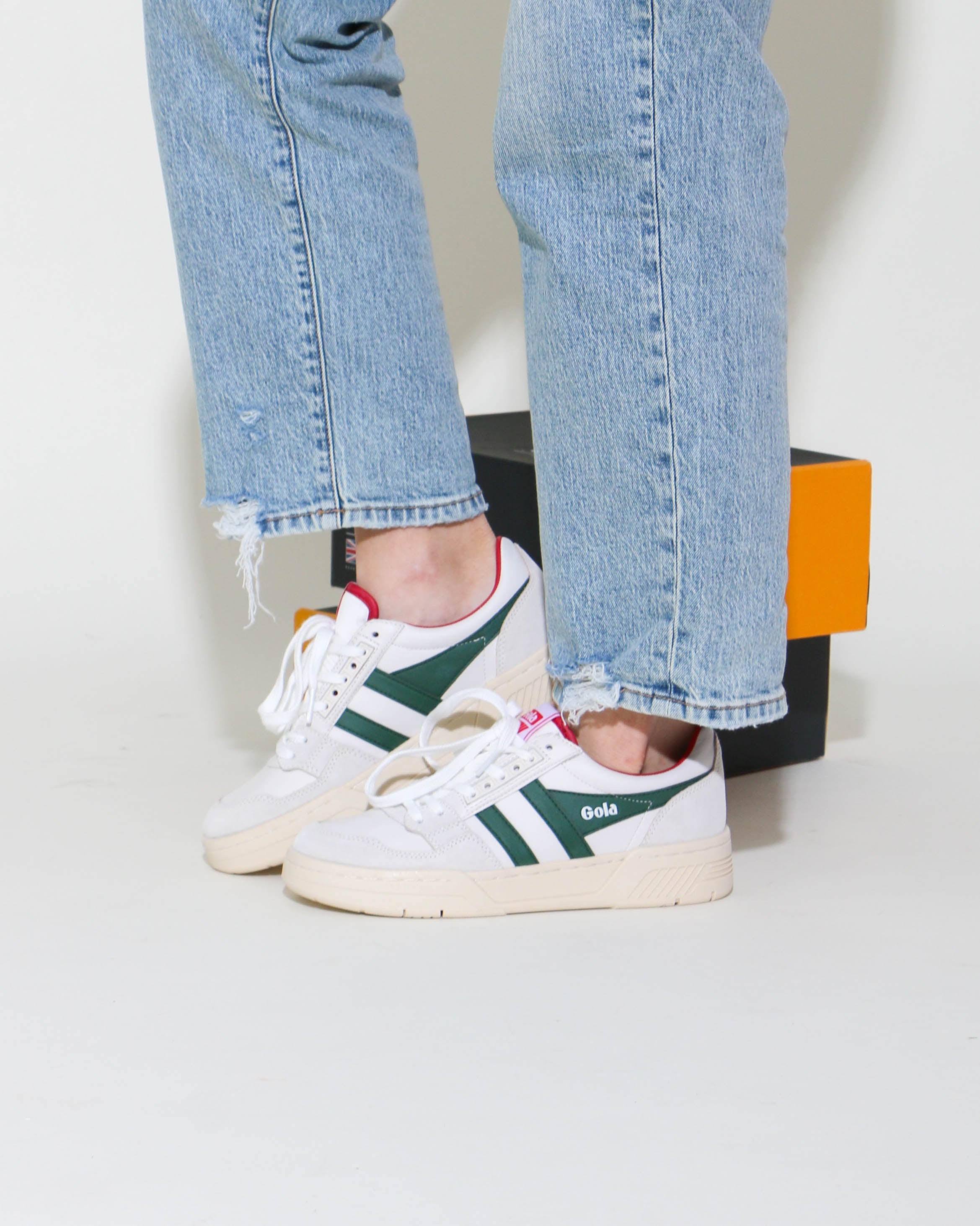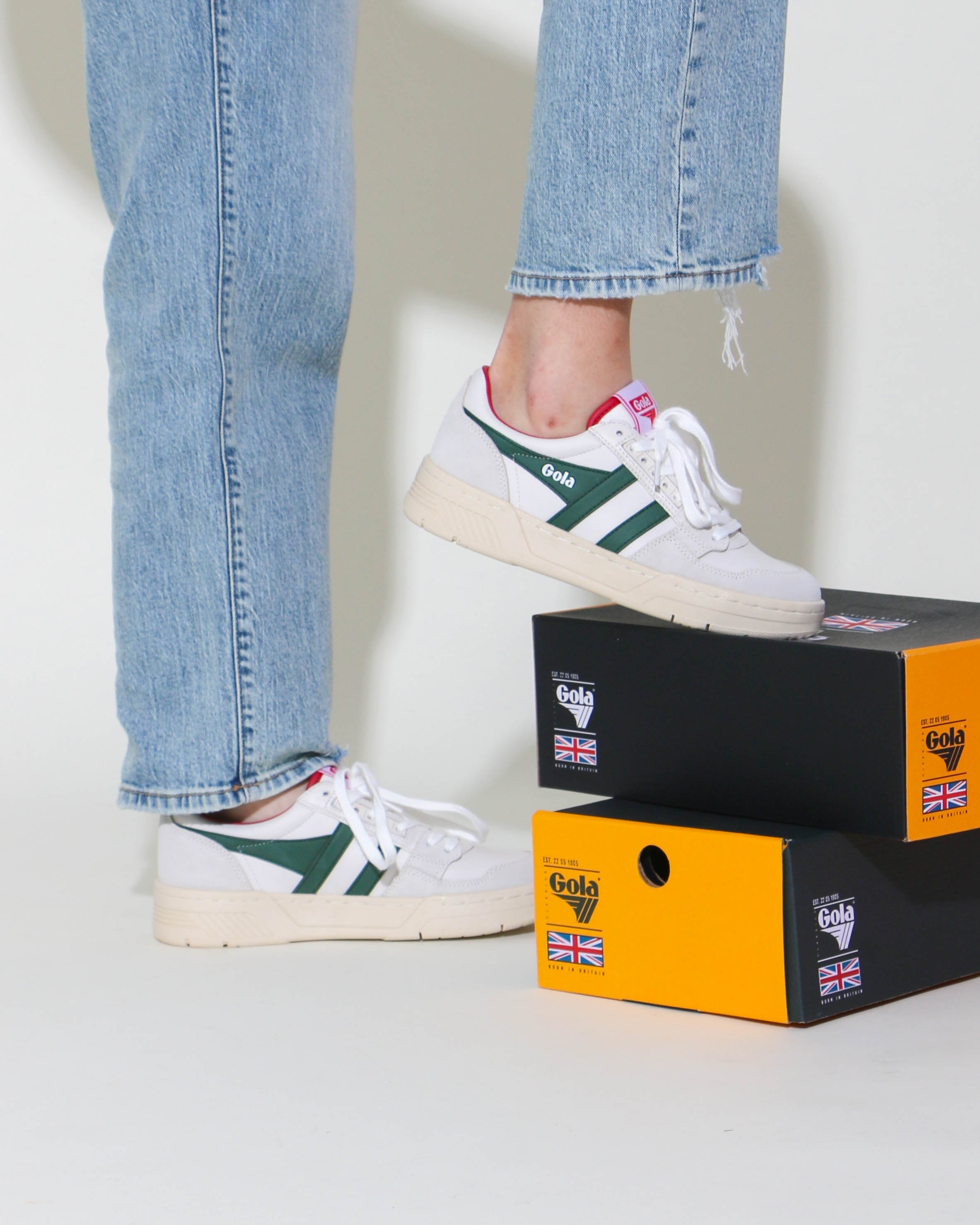Challenge ’84 follows the sneaker trend for ‘80s referenced deeper sole units. Gola takes the look up a level with eye catching colour combinations; a crisp white leather upper is complemented with evergreen Gola wingflash branding to the sides and a raspberry pink lining to give a feminine take on the look. This fashion forward women’s laced, low top Gola sneaker will look equally at home with your favourite denim or styled for a relaxed day at the office.