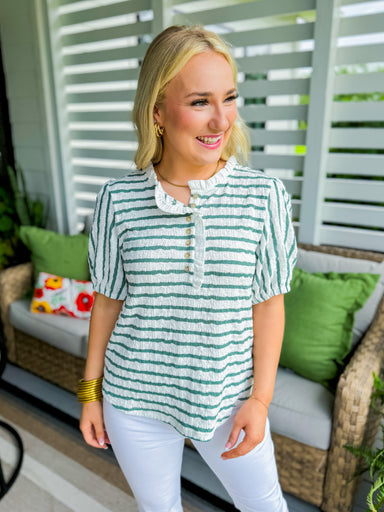 This green and white stripe knit top features a charming ruffled neck and button-up detailing, adding a touch of elegance to your ensemble. Perfect...