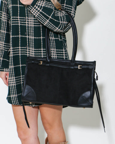 Elevate your style game with our Suede Buckle Shoulder Bag in Black. Crafted with luxurious suede and featuring a stylish buckle closure, this bag ...