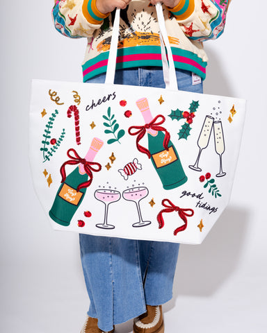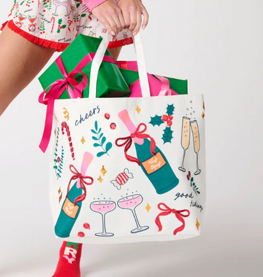 Pop, fizz, and carry on with the Bubbles Gifting Tote! Bursting with holiday cheer, this festive white tote is adorned with playful champagne bottl...