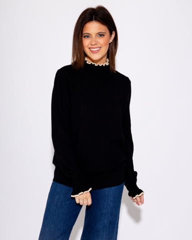 Add a touch of feminine charm to your wardrobe with this black knit sweater, highlighted by delicate cream ruffle trim along the crew neckline and ...