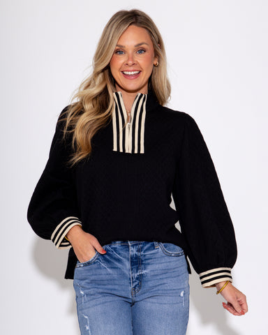 Elevate your wardrobe with the Edge & Ease Zip Top, featuring dramatic long puff sleeves and a textured fabric that adds depth and interest. Th...