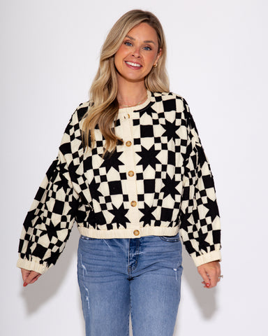 Turn heads in this stunning quilted star patch jacket that effortlessly transitions from casual to polished. Featuring bold black star patches agai...