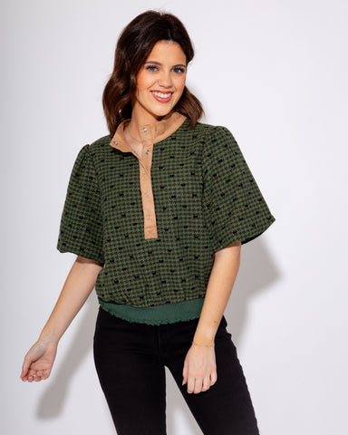 Elevate your style with the Hunter Green Floral Patch Top, featuring a distinctive yellow stripe neck band that adds a vibrant contrast. This uniqu...