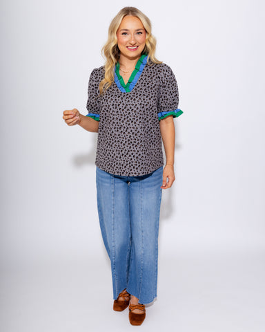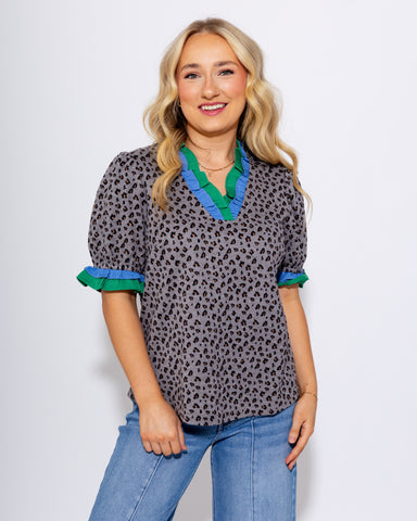 Elevate your style with the Double Contrast Ruffle Detailed Animal Printed Top. Featuring a subtle grey background with eye-catching blue and green...