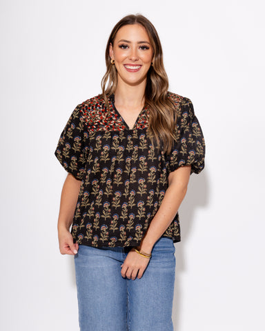 Add a touch of artisanal charm to your wardrobe with this black woven floral top. Featuring a textured woven panel across the chest in shades of re...