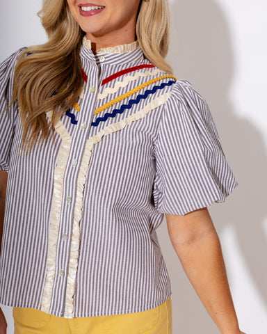 Classic meets playful in this gray and white striped button-up top with charming puff sleeves. Featuring colorful ric rac trim along the chest and ...