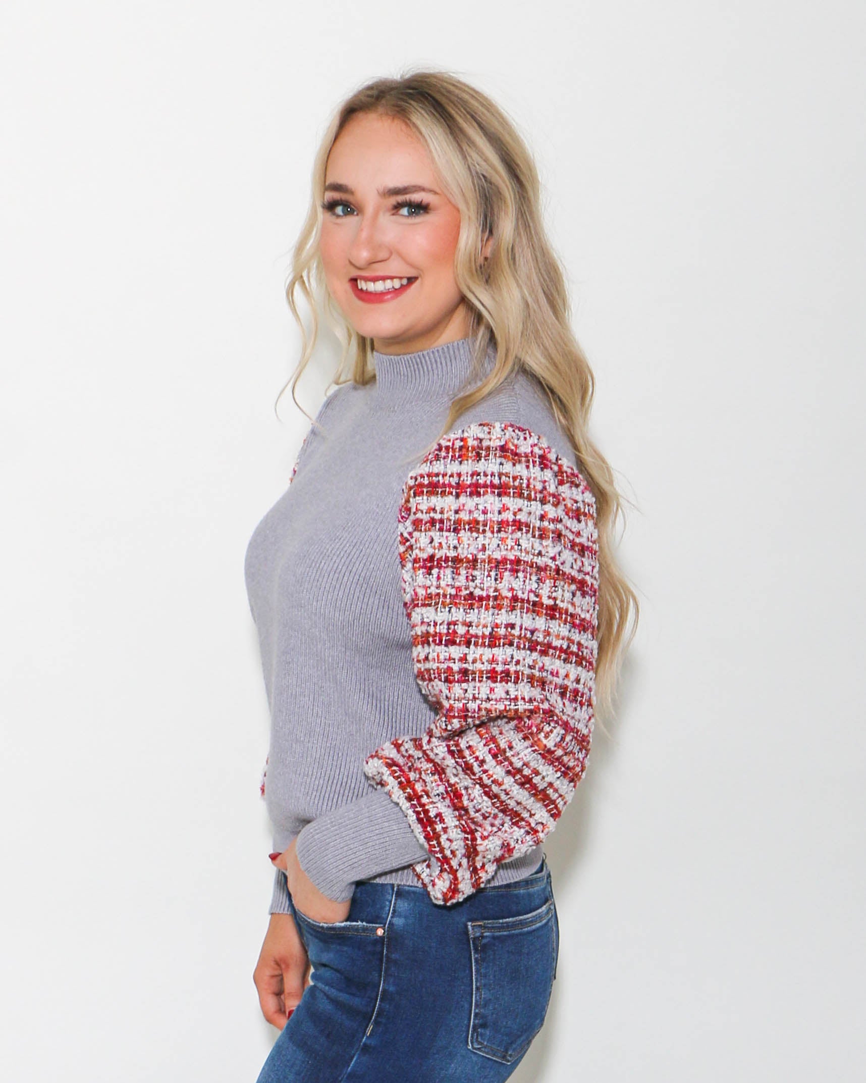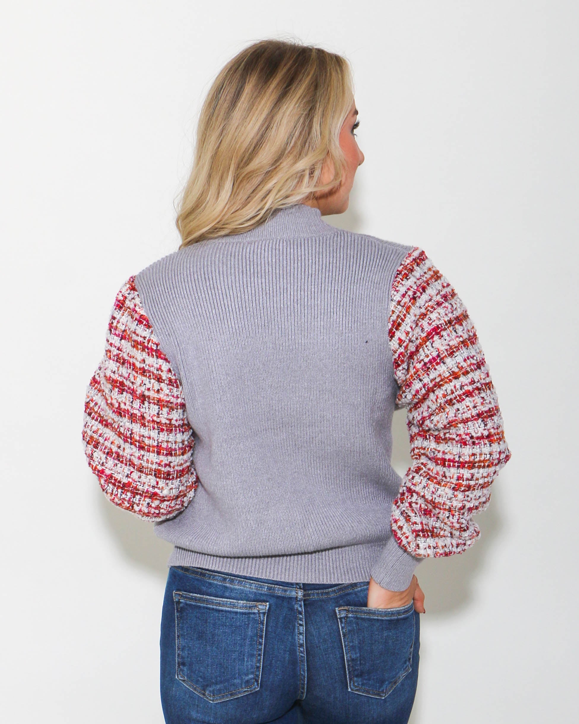Elevate your style with the THML Mixed Media Knit Sweater in Gray. Featuring eye-catching multi-colored sleeve details, this sweater blends comfort and fashion effortlessly. Perfect for any occasion, this versatile piece will add a pop of color and texture to your wardrobe. Upgrade your look today!