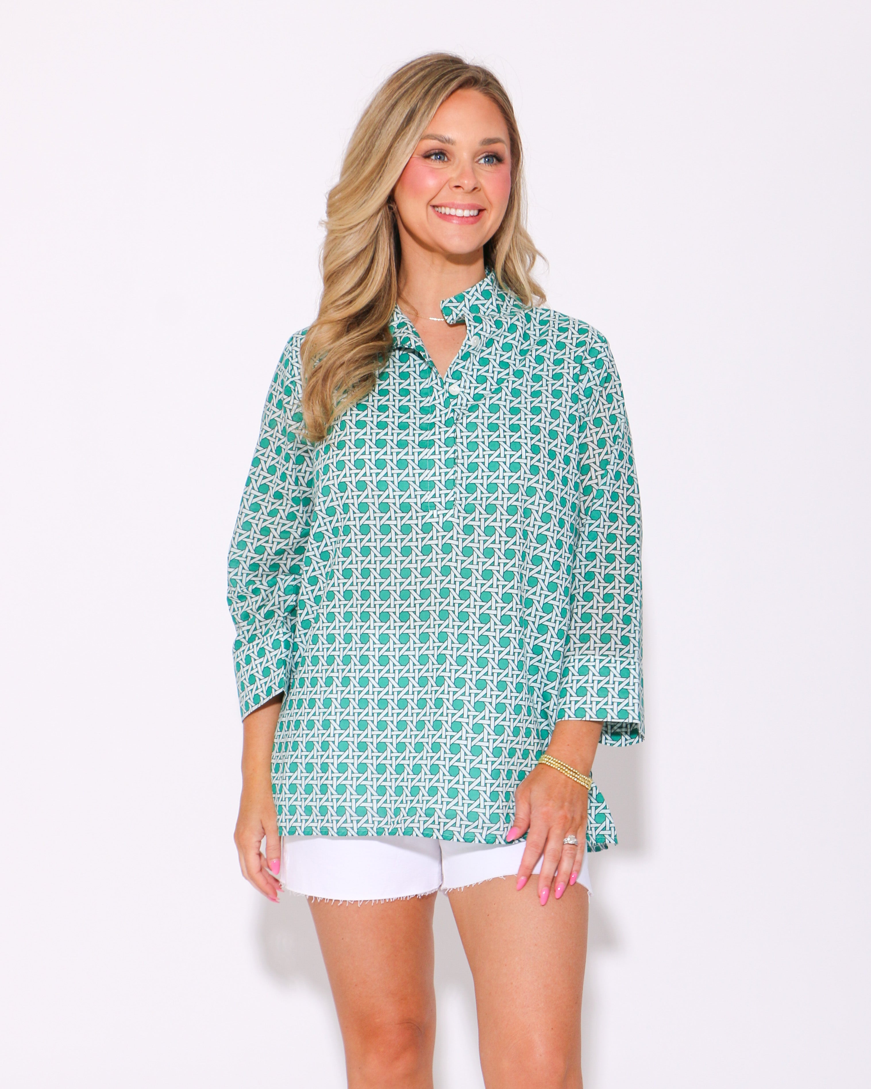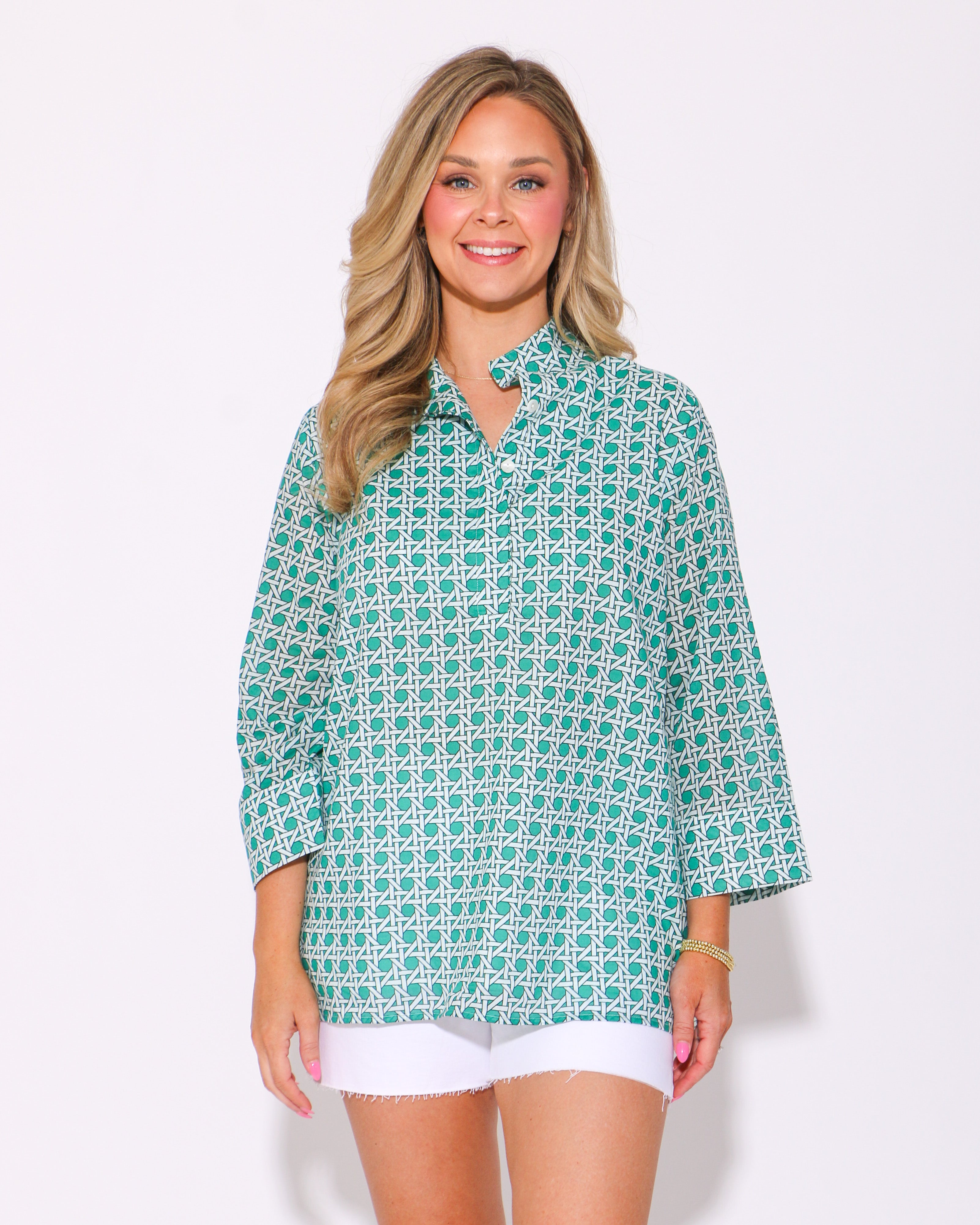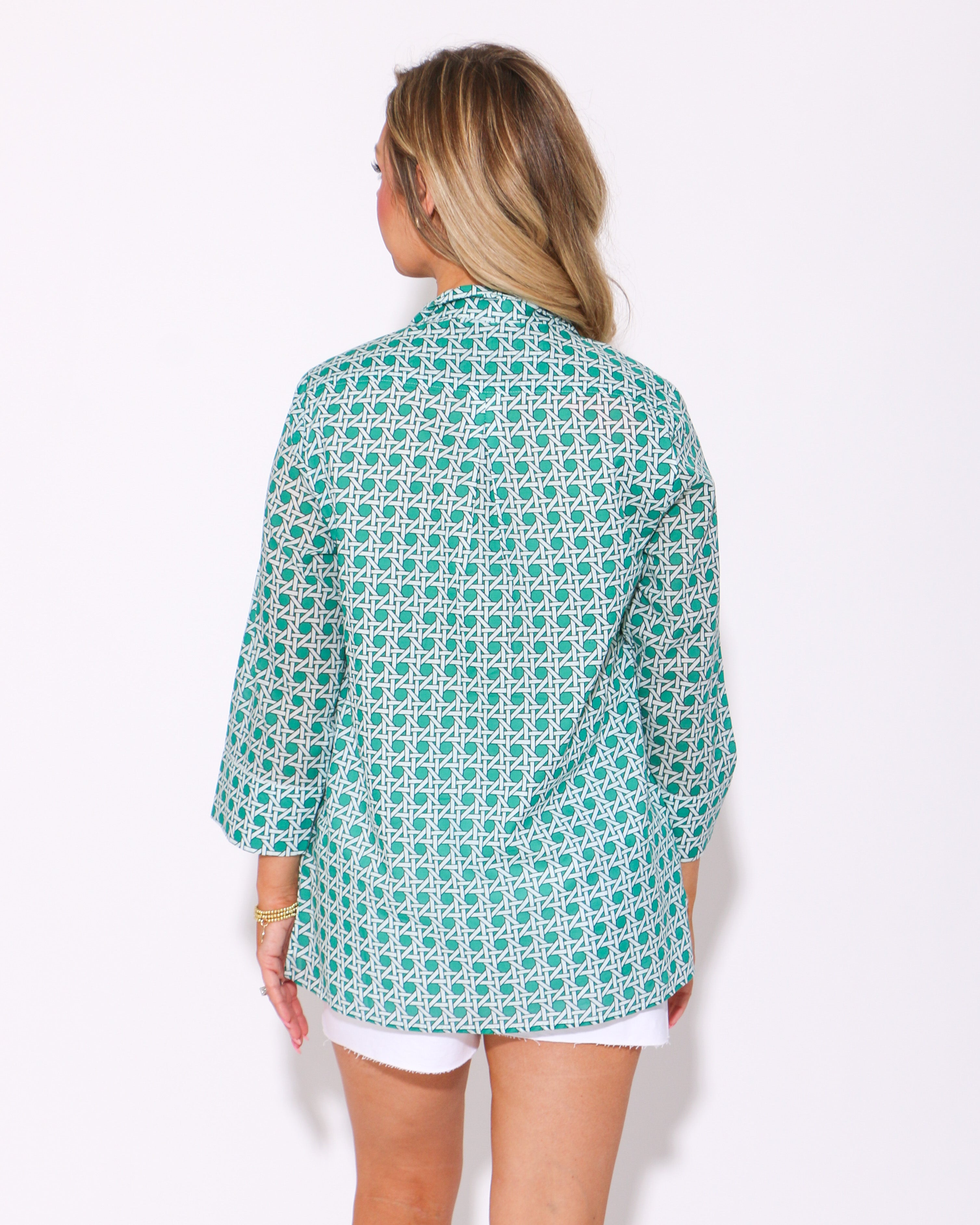 Unleash your inner nature lover with our Cricket Top in Rattan Jade! This stunning top features a unique white and jade green abstract print that is sure to turn heads. Made from airy, lightweight material, it's perfect for those warm summer days. The long sleeves and collared design add a touch of sophistication, while the button-up style allows for easy wear. Stay effortlessly chic and comfortable with our Cricket Top!