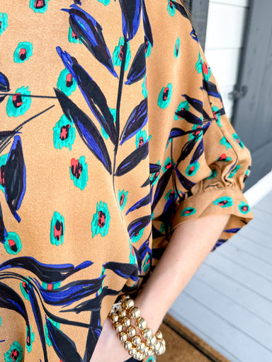 Elevate your wardrobe with this elegant floral print top featuring a rich burgundy background accented by striking blue and green along the necklin...