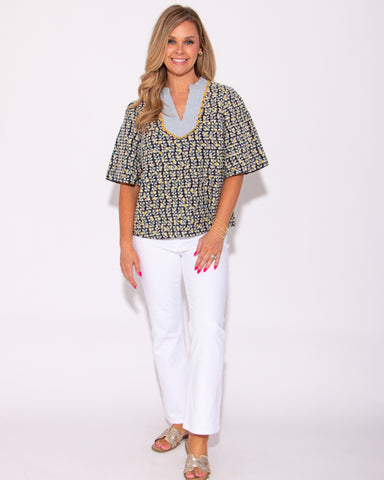 Add a playful touch to your wardrobe with this navy plaid flutter sleeve top. Featuring scallop trim accents and a contrast V-neck with a caftan-in...
