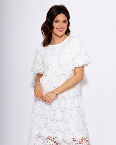 Elevate your wardrobe with this sophisticated two-piece set featuring delicate scalloped lace detailing. The off-white top showcases charming puff ...