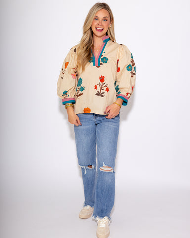 Floral Contrast Trim Puff Sleeve Top in Ecru