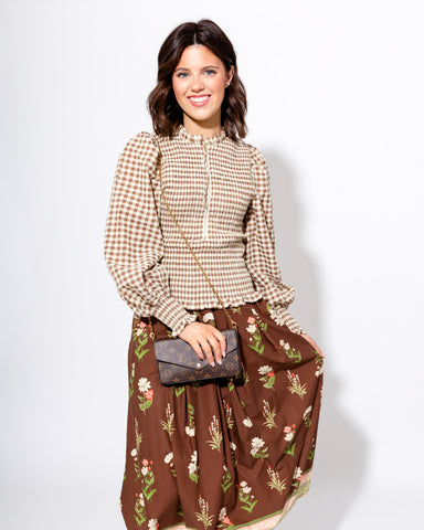 Soft, feminine, and effortlessly chic, the Gingham Glow Zip Front Top is a versatile staple for your wardrobe. Featuring a smocked bodice and ruffl...