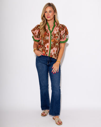 Soft, feminine, and effortlessly charming, this floral print top features delicate shades of muted and light pink blooms set against a warm brown b...