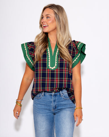 Add a playful touch to your wardrobe with this navy plaid flutter sleeve top. Featuring scallop trim accents and a contrast V-neck with a caftan-in...