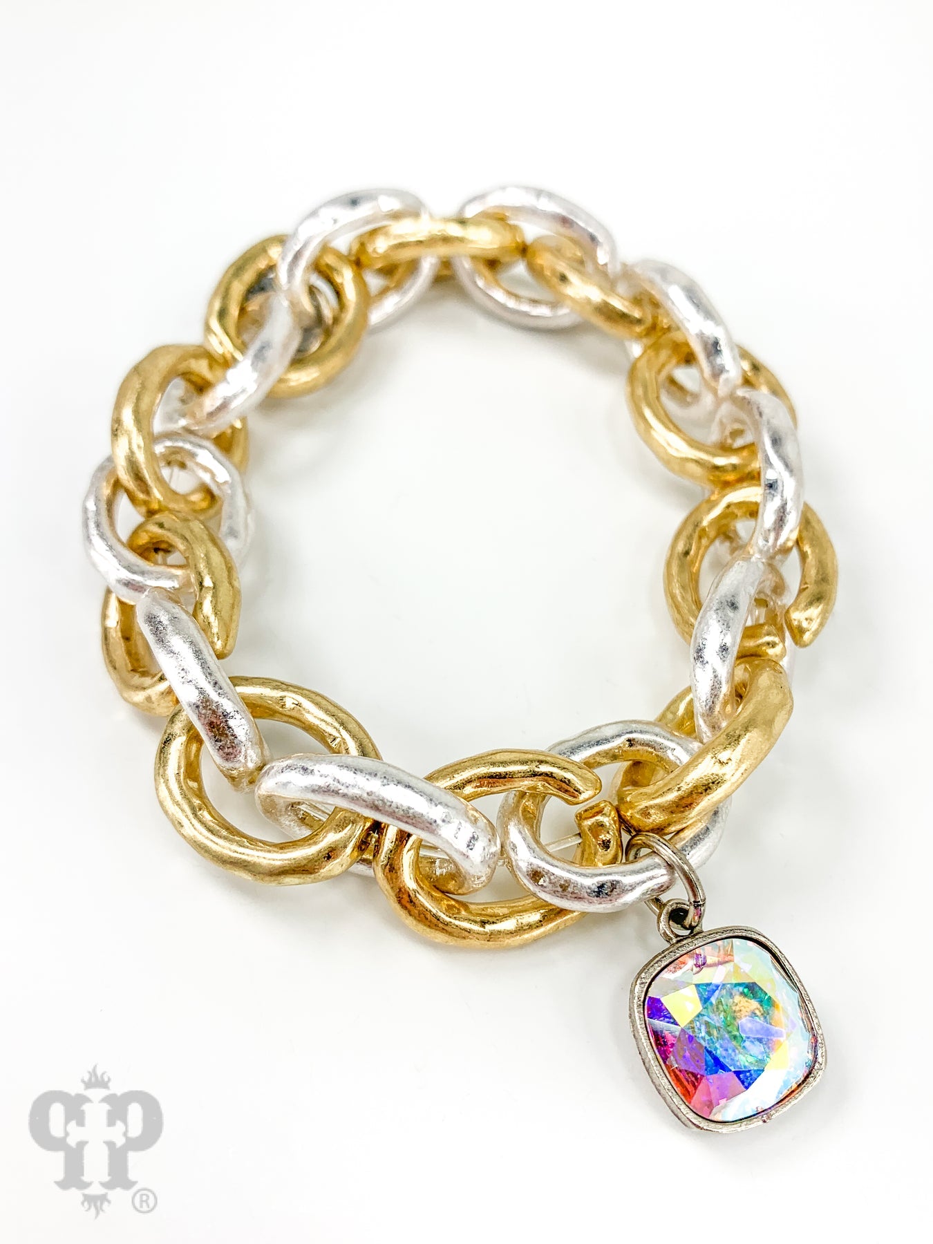Large link MATTE TWO TONE hammered link stretch bracelet with SILVER AB cushion cut drop