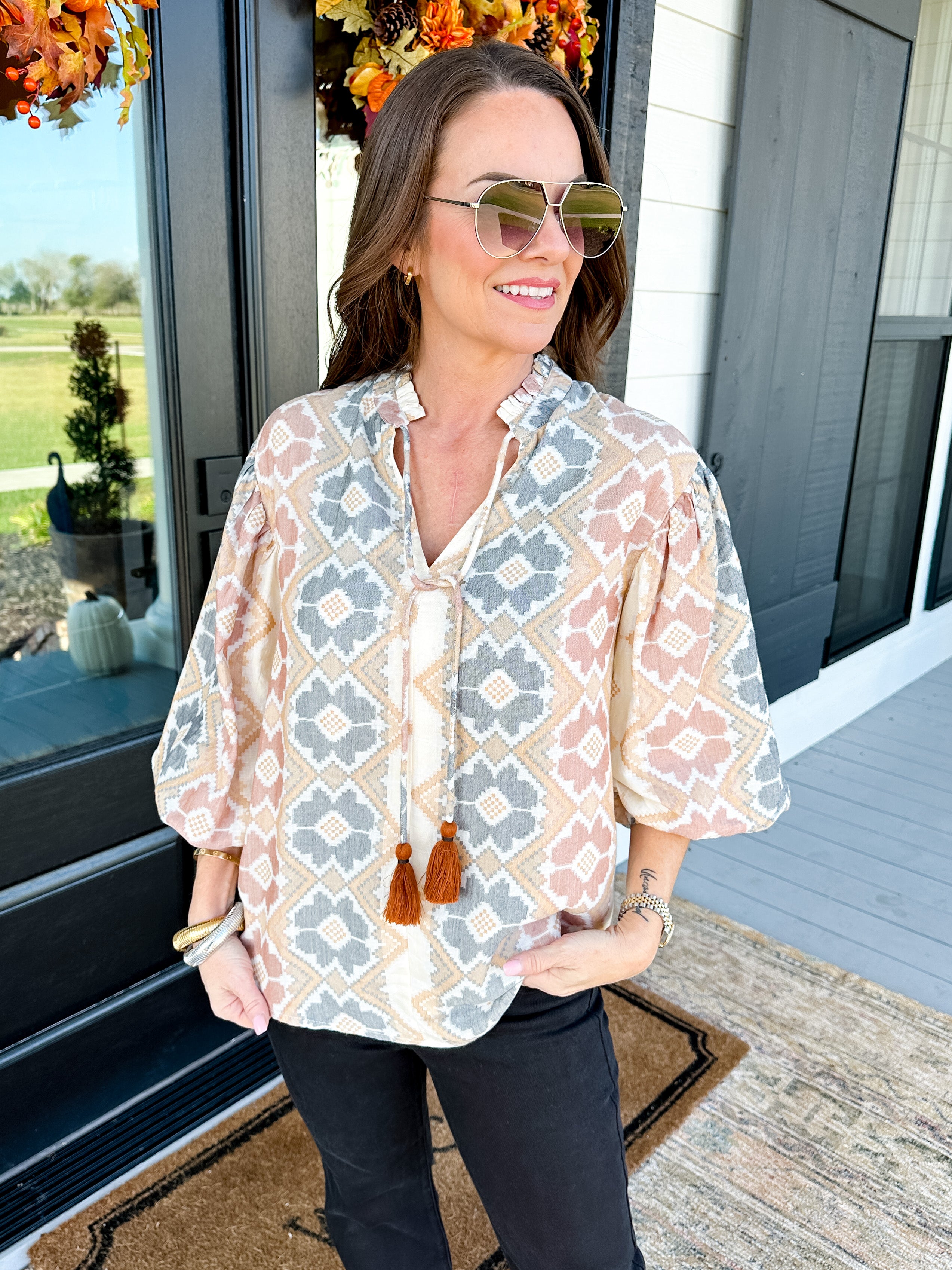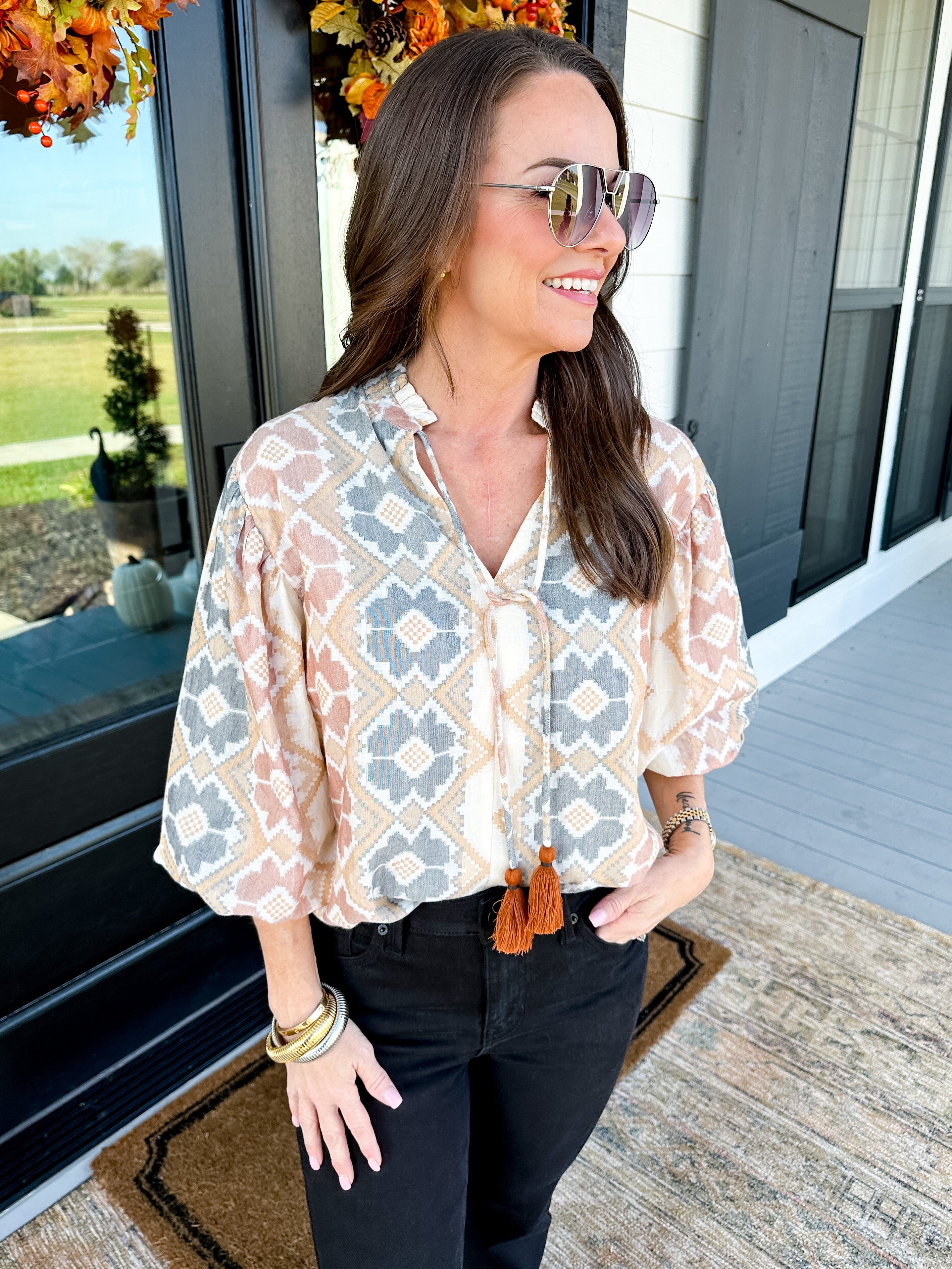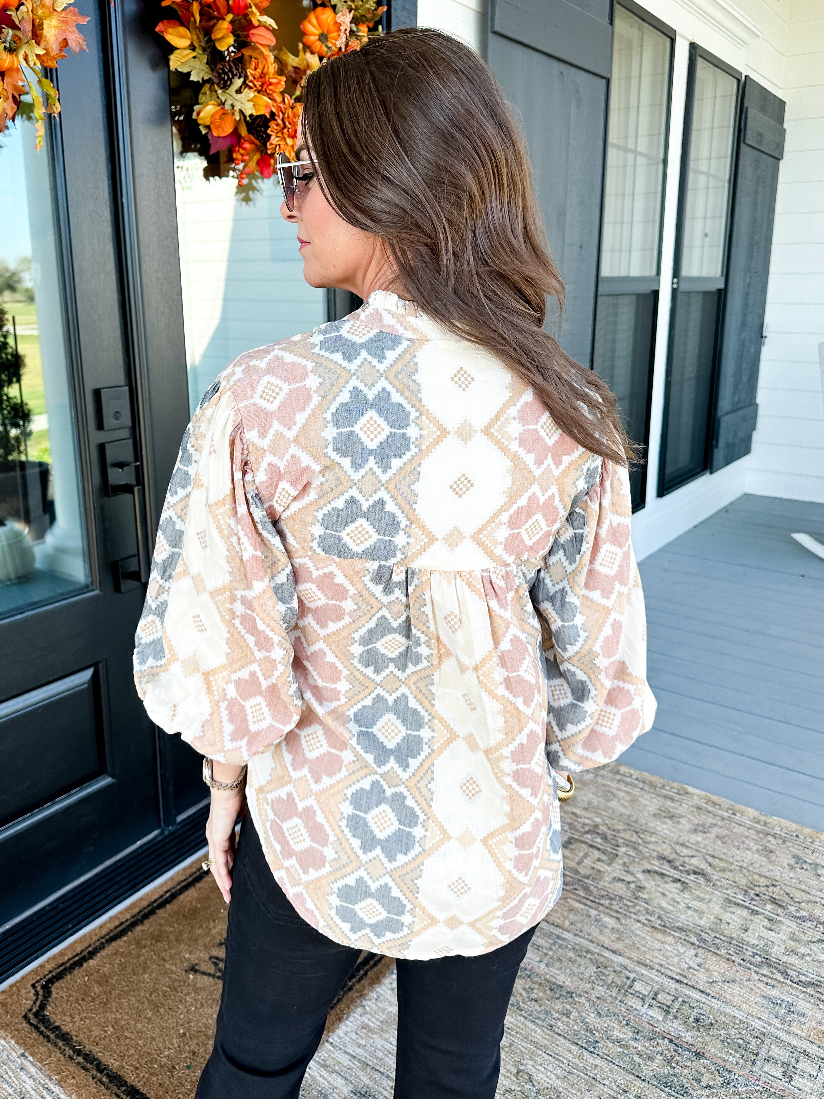 Elevate your wardrobe with our Balloon Sleeve Top, a versatile piece that seamlessly combines comfort with a touch of bohemian flair. The neutral hue provides a versatile canvas for the captivating Aztec pattern, creating a dynamic visual appeal. Crafted with meticulous attention to detail, this top is perfect for making a stylish statement. This top effortlessly combines comfort with bohemian flair, making it a versatile piece for any fashion-conscious individual.