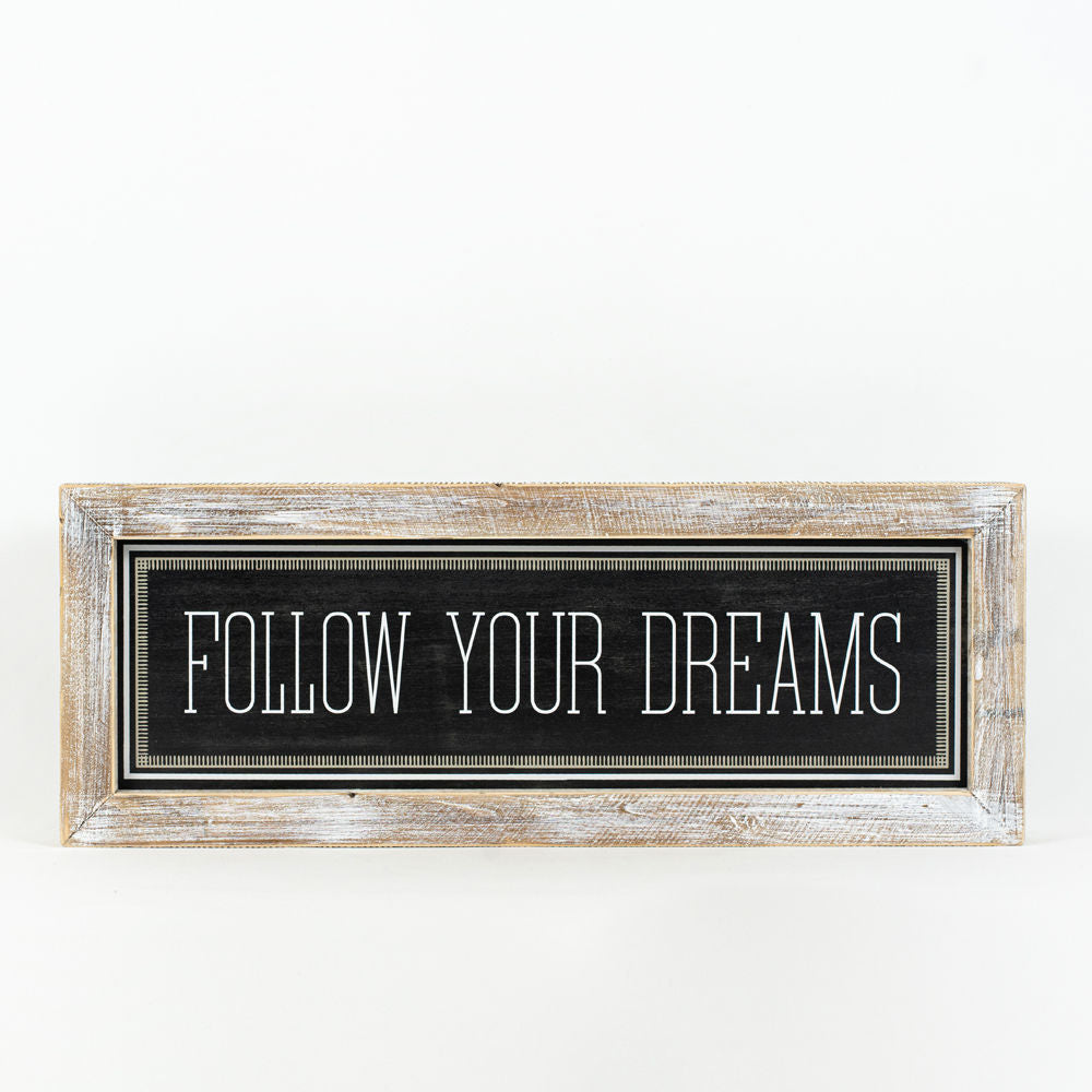 Christmas is fast approaching so fill your sleigh with this reversible wood-framed sign today! It comes in white, and gray colors and a script that says, "Ho ho Ho!" on one side and "FOLLOW YOUR DREAMS" on the other side. With dimensions of 24" by 9" by 2", this reversible framed sign can be hung on the wall or stand on its own. Adams and Co has been designing on-trend home and holiday accessories since 2002, we have always had the same passion and simple philosophy - Inspired by life. We design our products based on what inspires us and we hope that you enjoy our designs as much as we do. We carry products that include everything from a traditional home, to inspirational, and seasonal decor. Each is carefully planned and fervently designed to transform your place into a home.