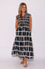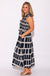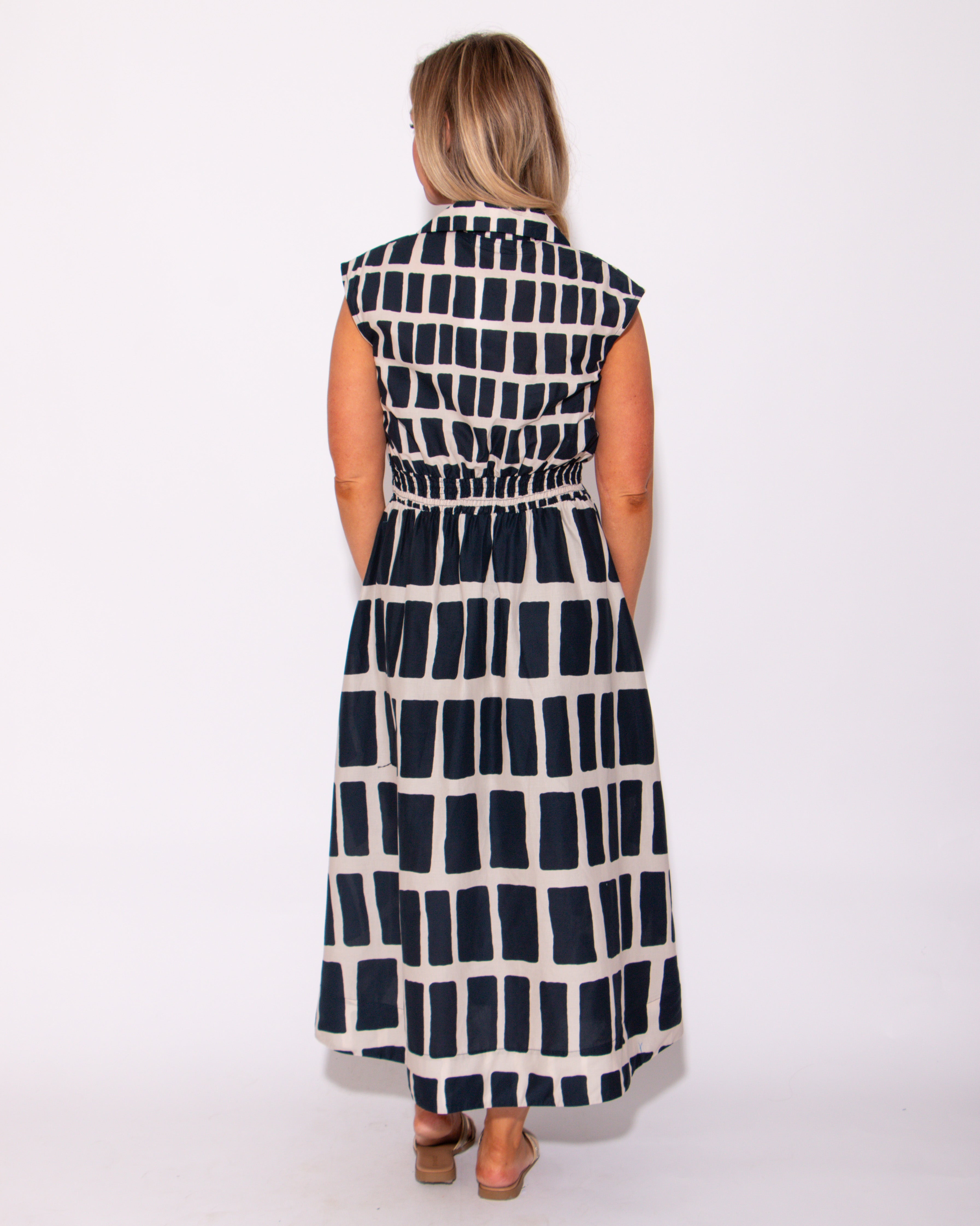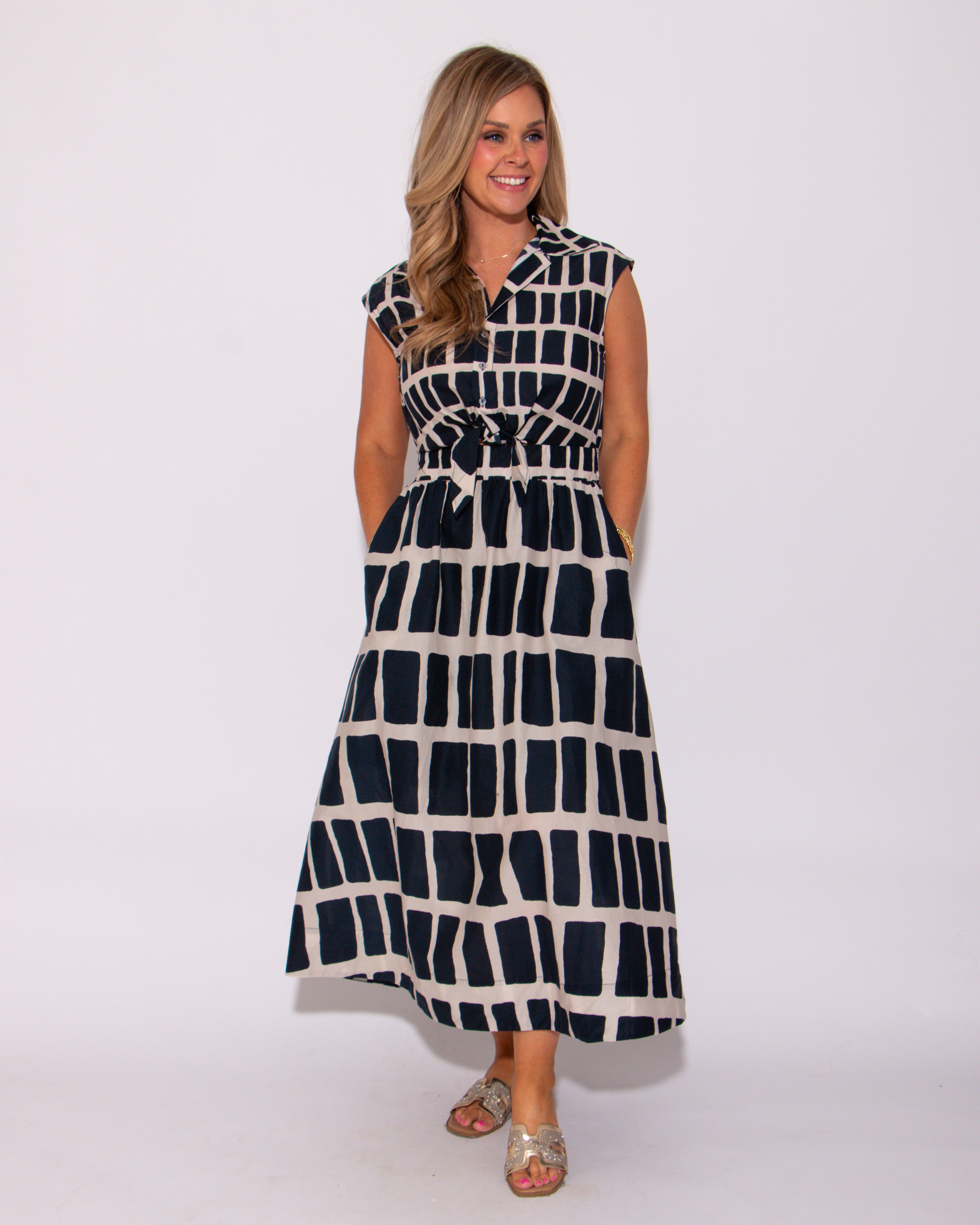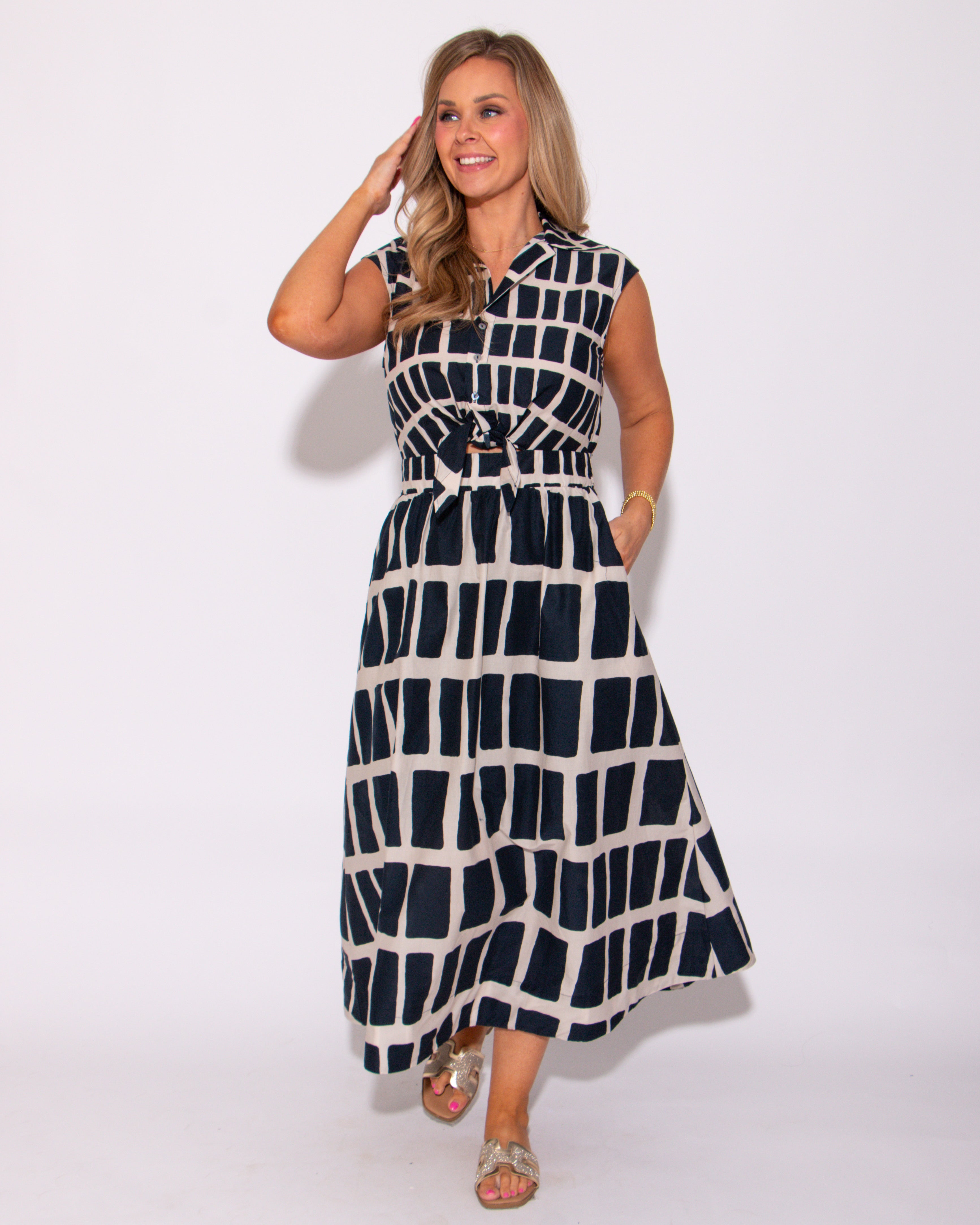 Effortlessly chic and versatile, the Abstract Drift Navy Midi Dress boasts a vibrant abstract print, trendy collar button front with knot closure, and practical pockets. Its smocked back waistband offers a comfortable fit while the lightweight woven fabric drapes beautifully. Perfect for any occasion, this dress is sure to make a statement.