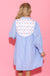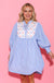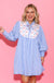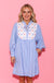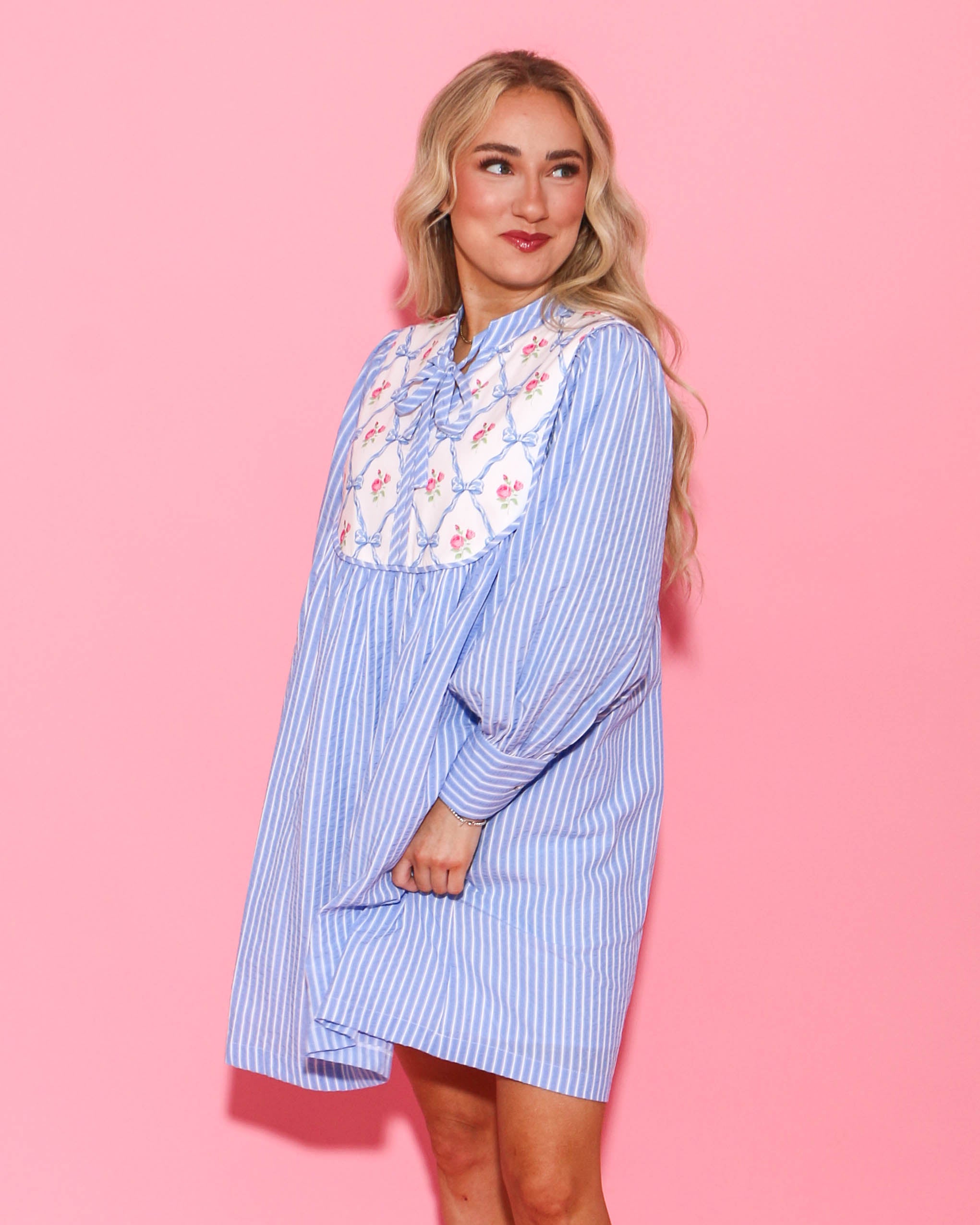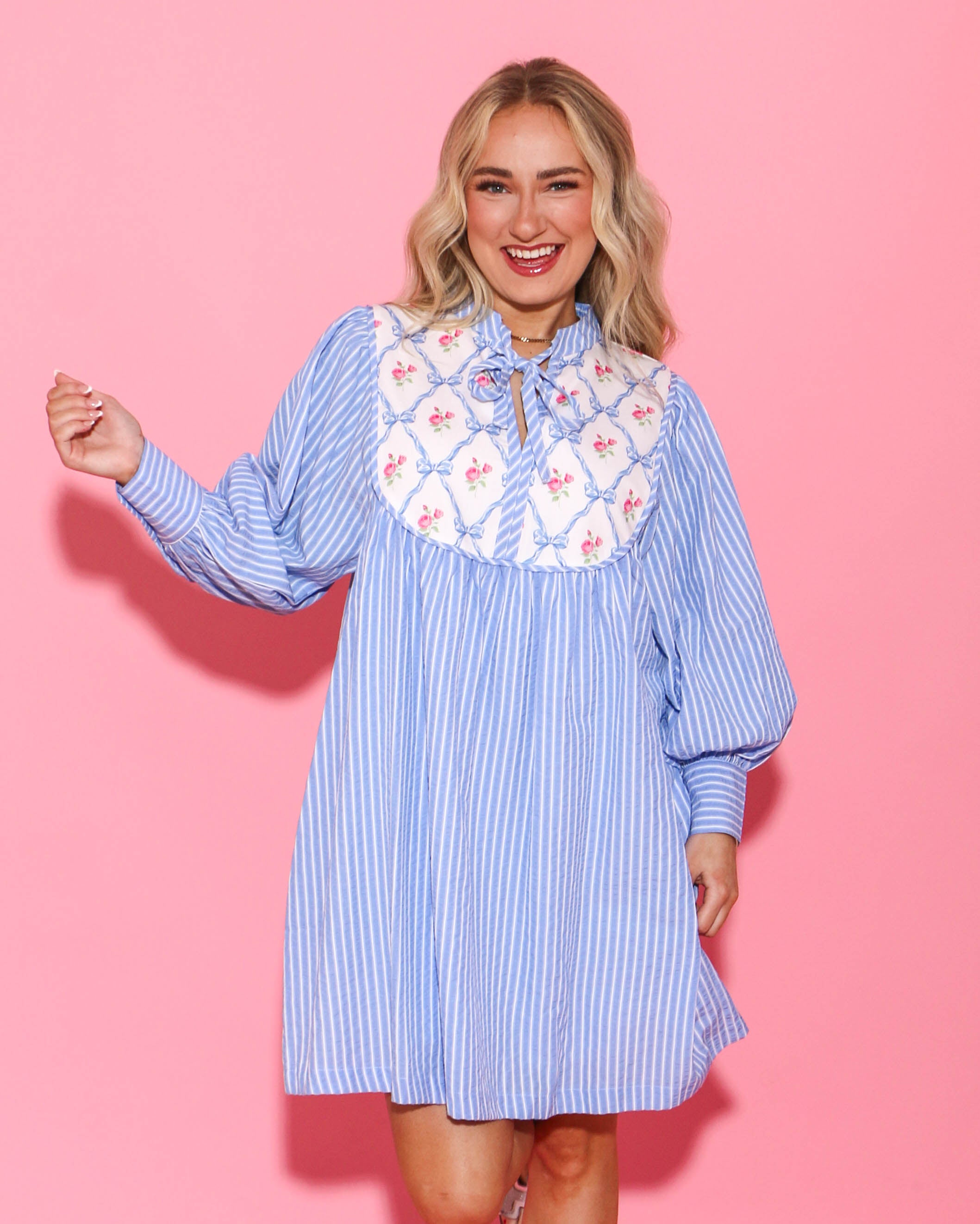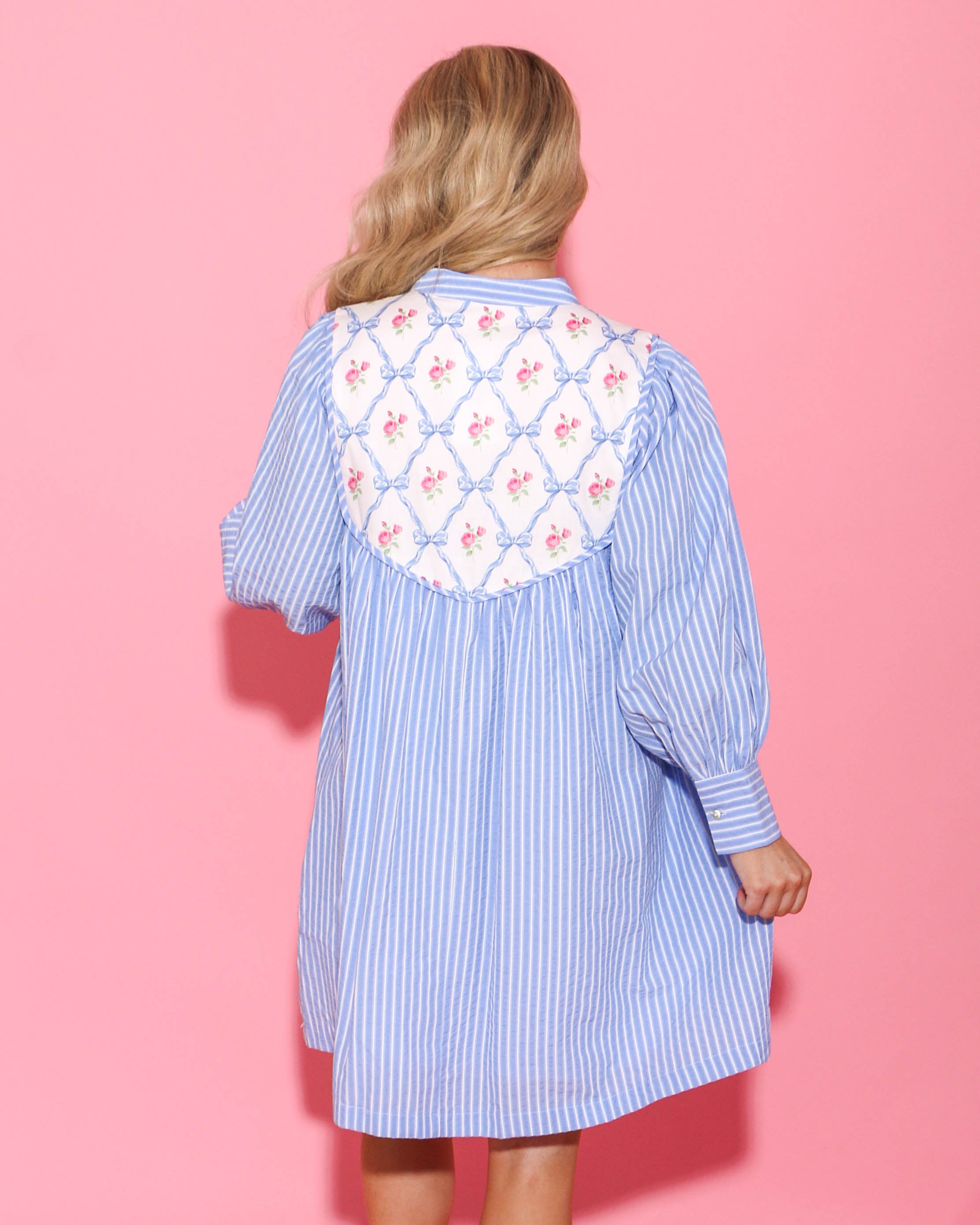 Feel effortlessly chic in our Blue Striped and Floral Ribbon Print Dress! This pullover mini dress features a ¾ button closure cuff sleeve and a stunning floral ribbon pattern yoke. The front neck band tie closure adds a touch of elegance, while the pockets provide convenience. Lined and lightweight, this dress is perfect for any occasion.