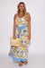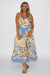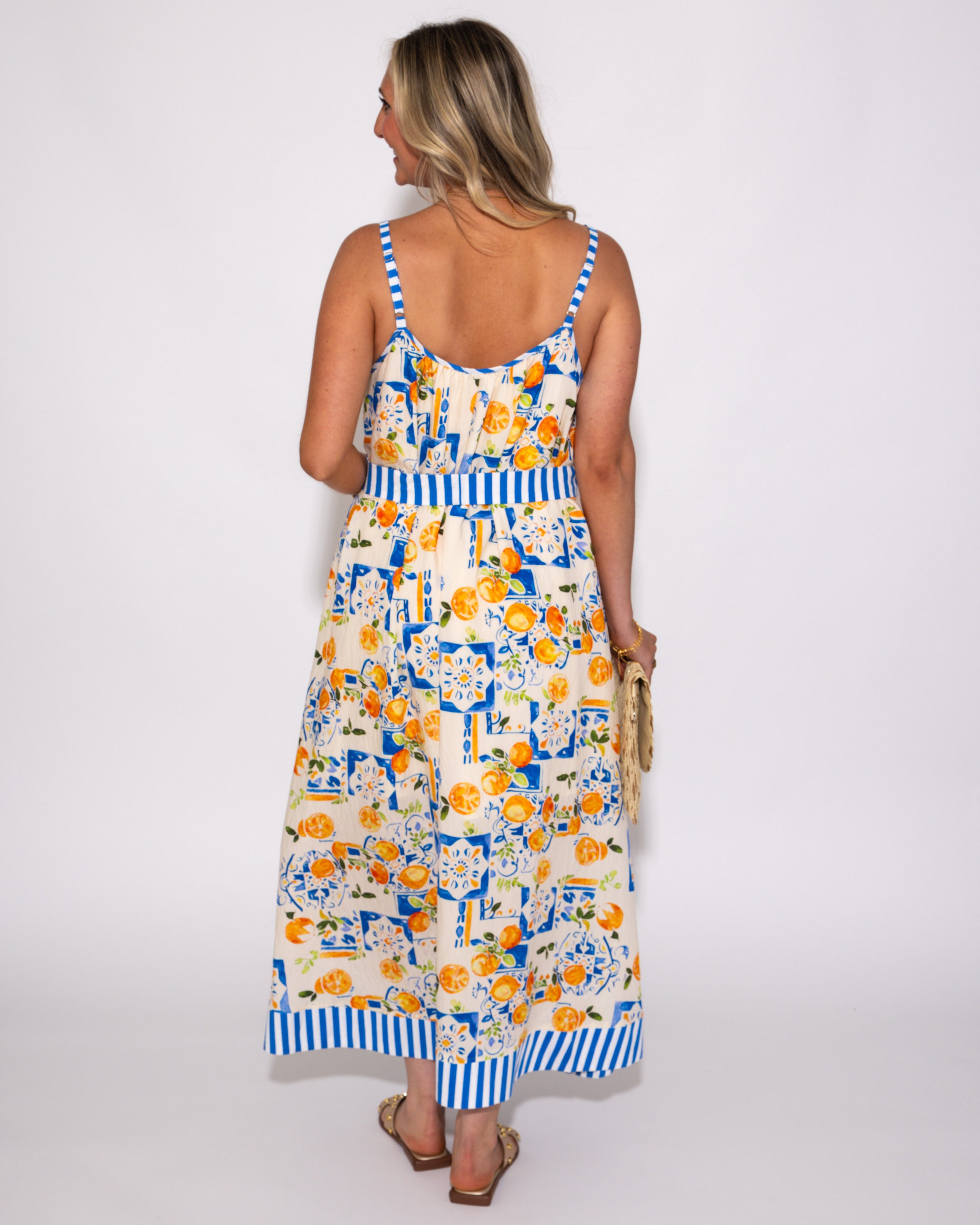 Indulge in playful sophistication with the Clementine Bloom Midi Dress. This multi-print dress features adjustable shoulder straps and a stripe contrast accent, with a removable tie at the waist and convenient pockets at the sides. The lightweight, non-sheer fabric is perfect for any occasion. Feel effortlessly stylish and confident in this lined, woven midi dress.