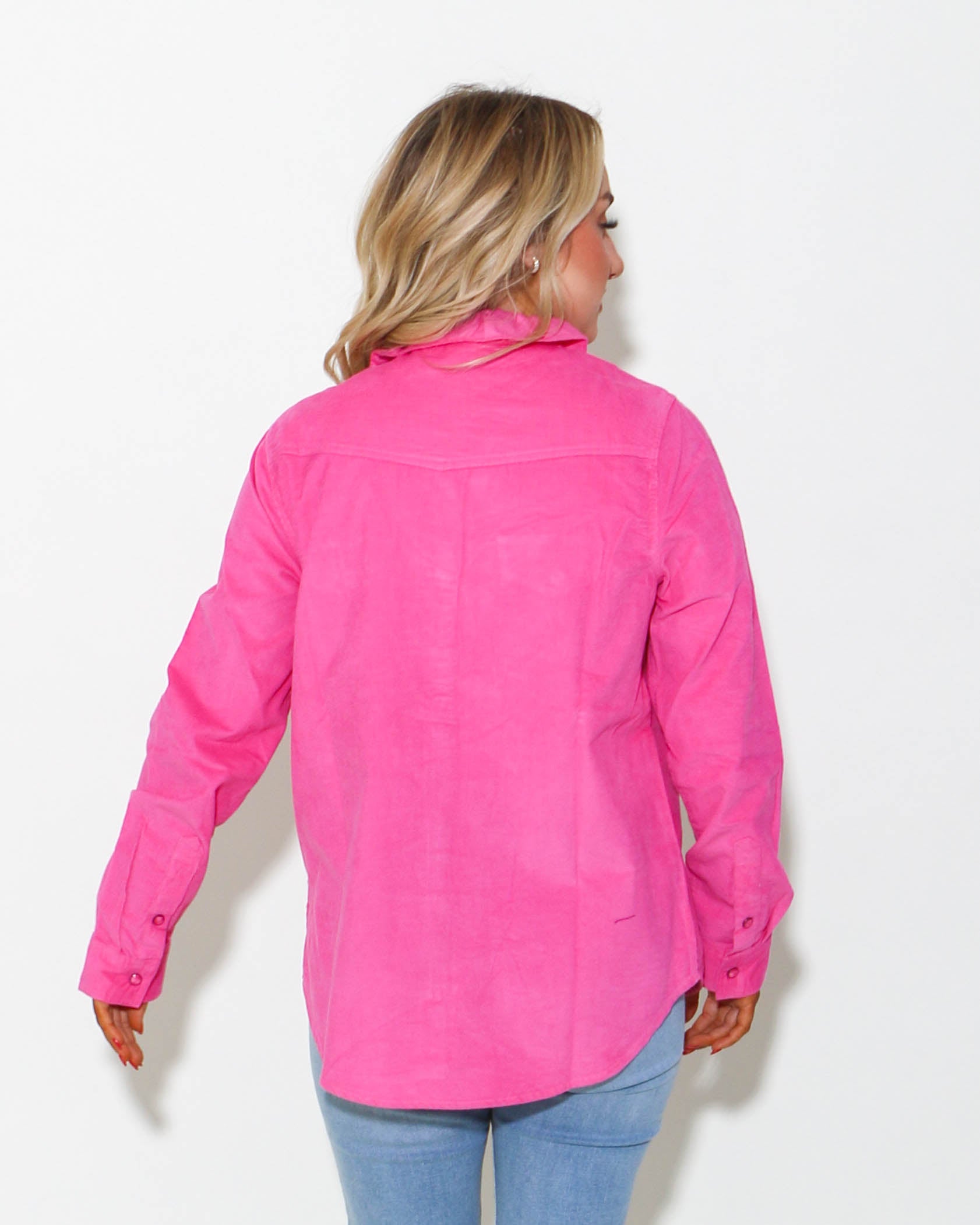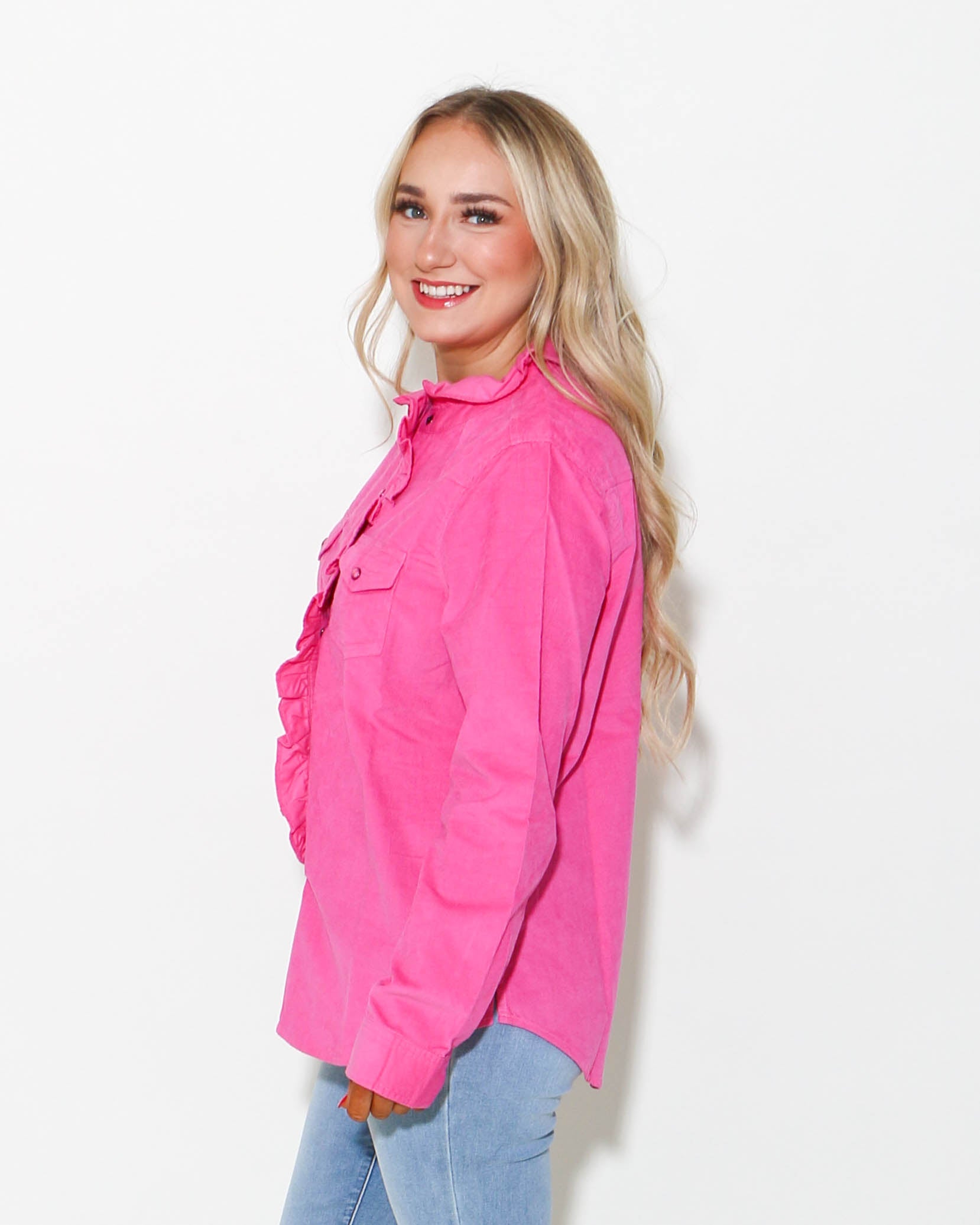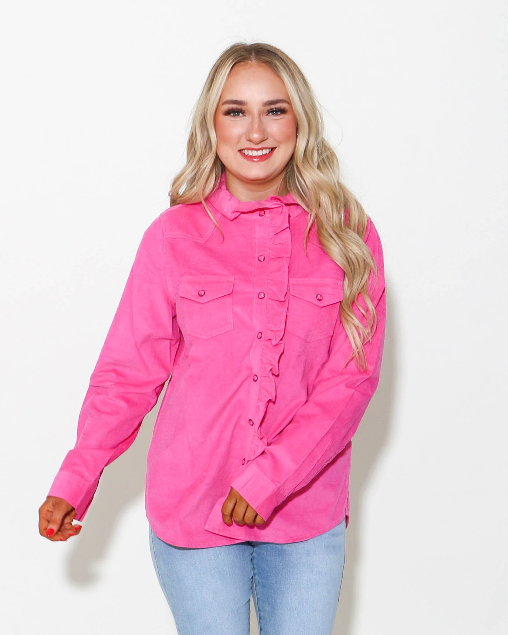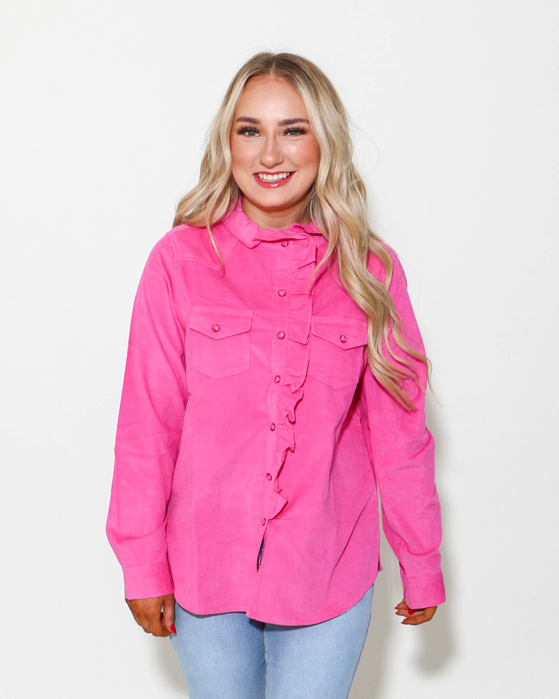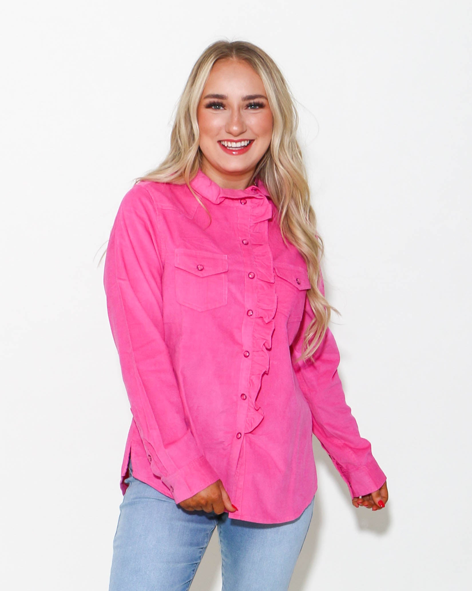 Experience style and comfort with our Corduroy Ruffle Snap Shirt. Made with soft corduroy material, this shirt features delicate ruffle details and convenient snap buttons. Elevate your wardrobe with this versatile piece perfect for any occasion.