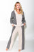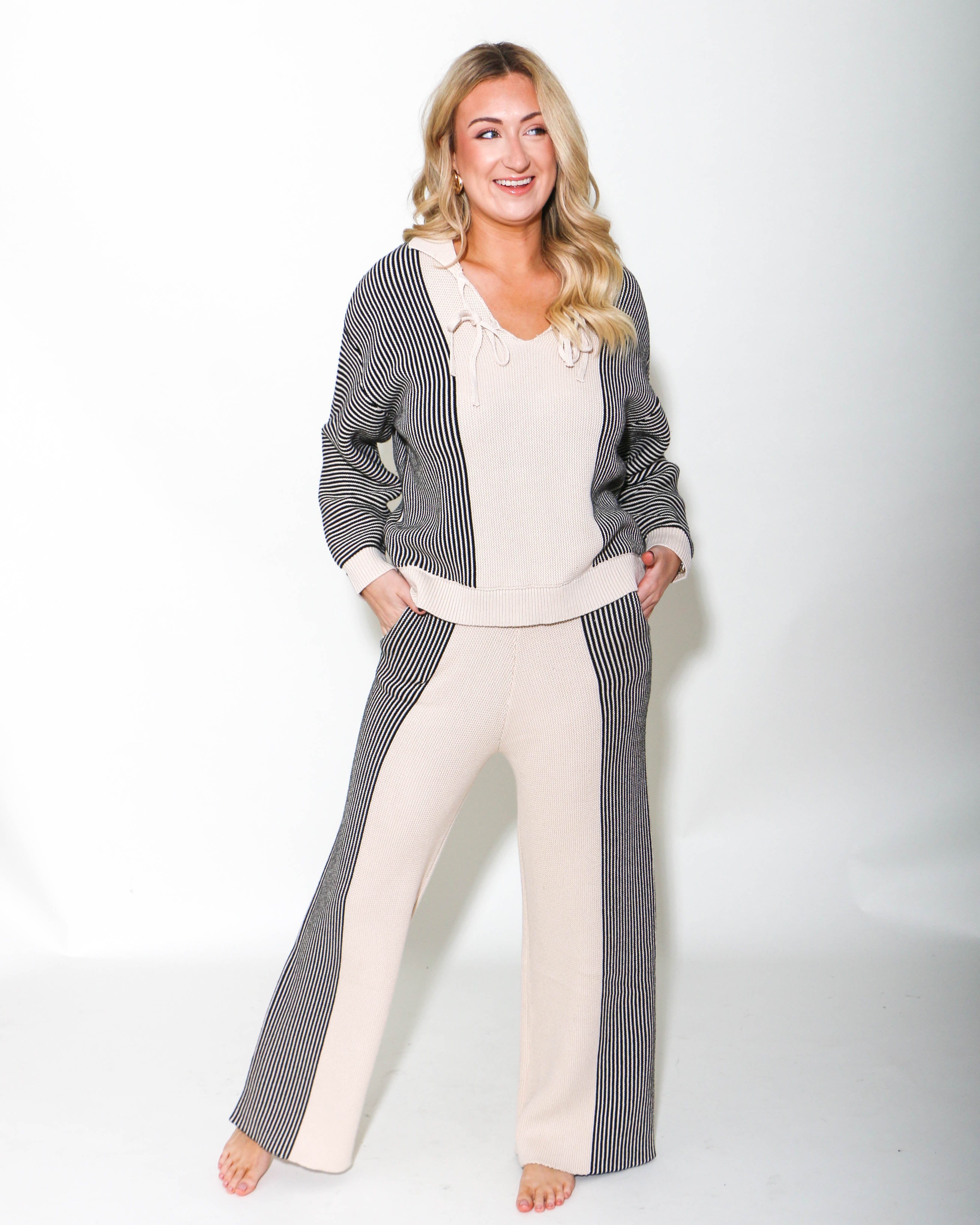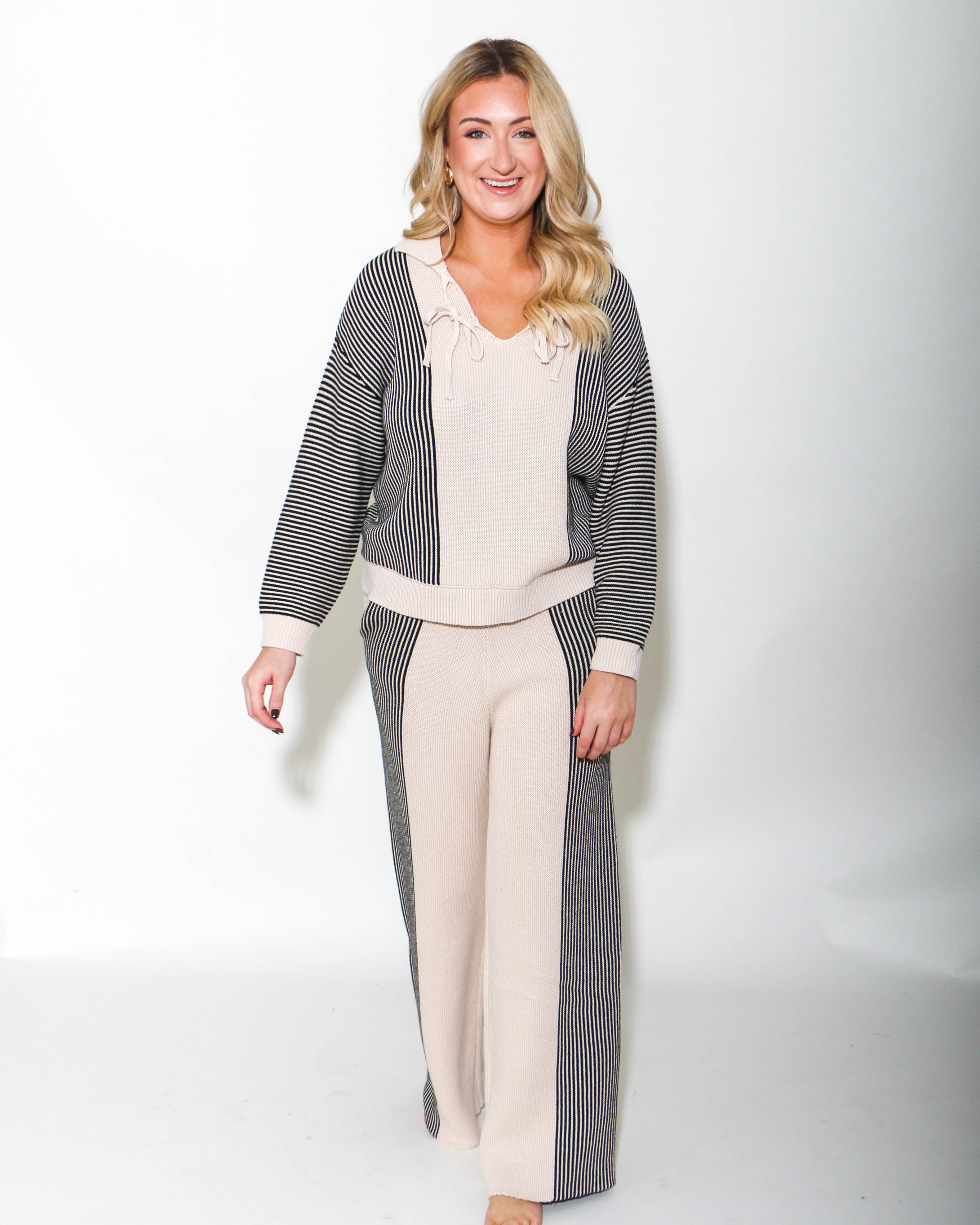 Enhance your style with these cream and black striped knit pants. These pants combine comfort and style, making them a versatile addition to any wardrobe. The contrast stripes elongate the legs while the soft knit fabric ensures a comfortable fit, perfect for lounging or casual outings. This sweater features a sophisticated black and white striped pattern, a relaxed fit, and a lace-up neckline with drop shoulders, creating a chic and modern look that will appeal to a wide range of customers.