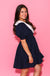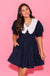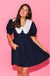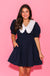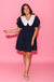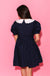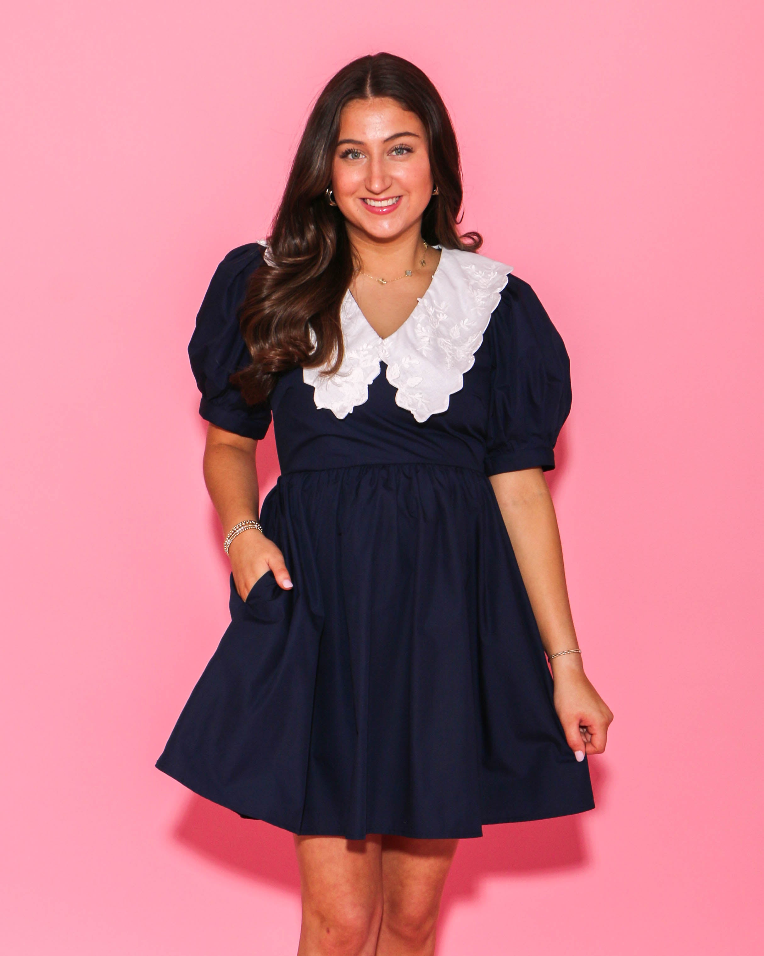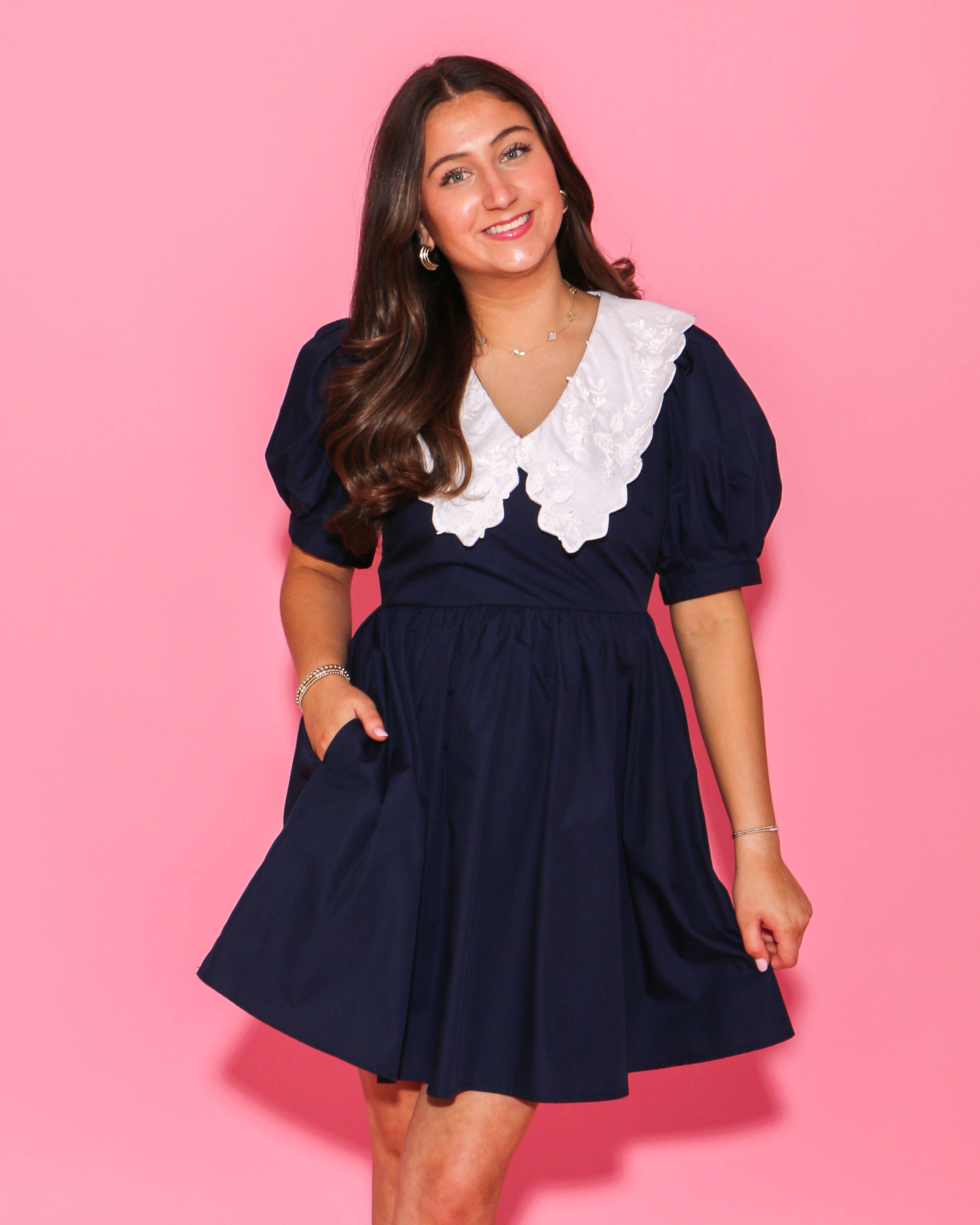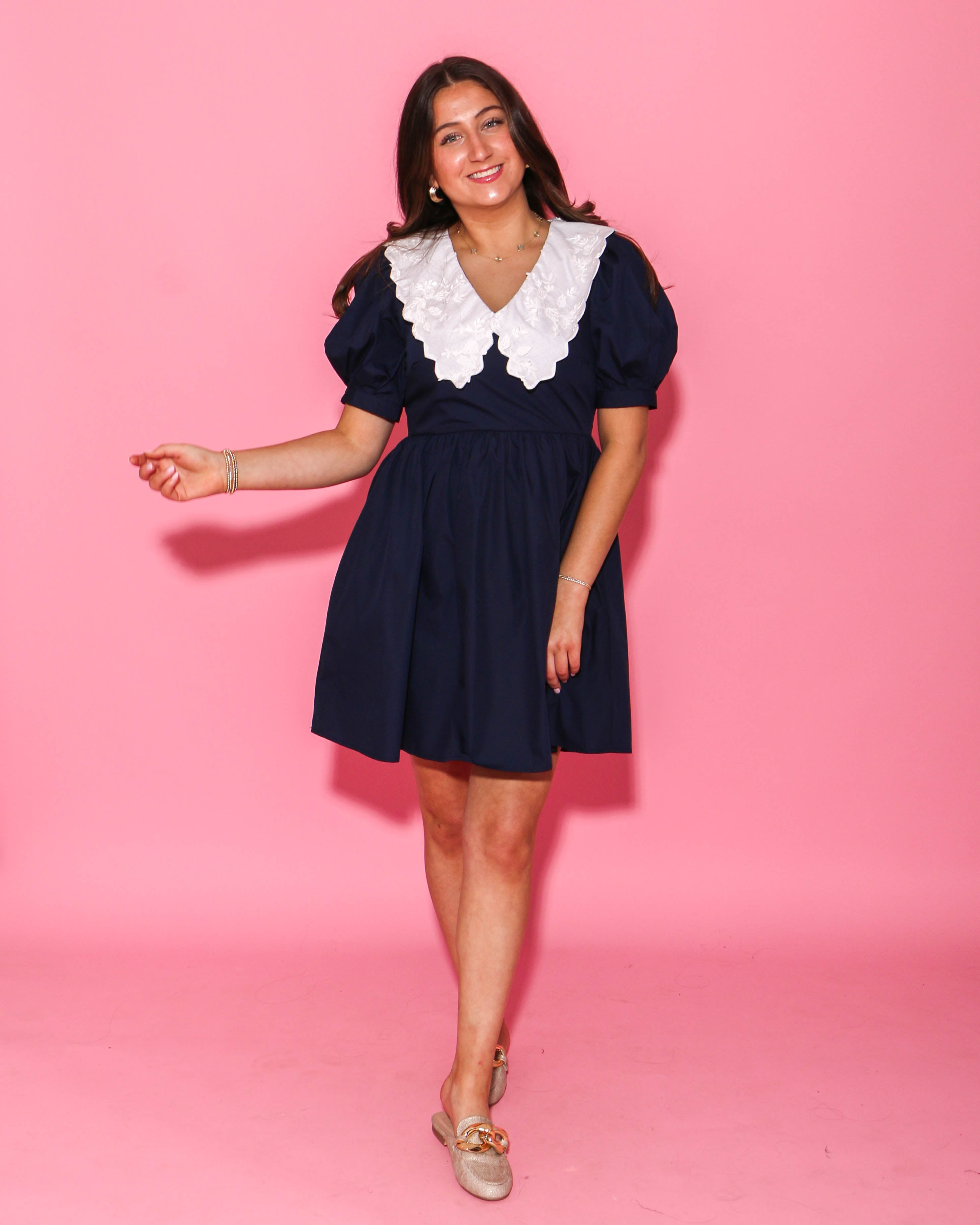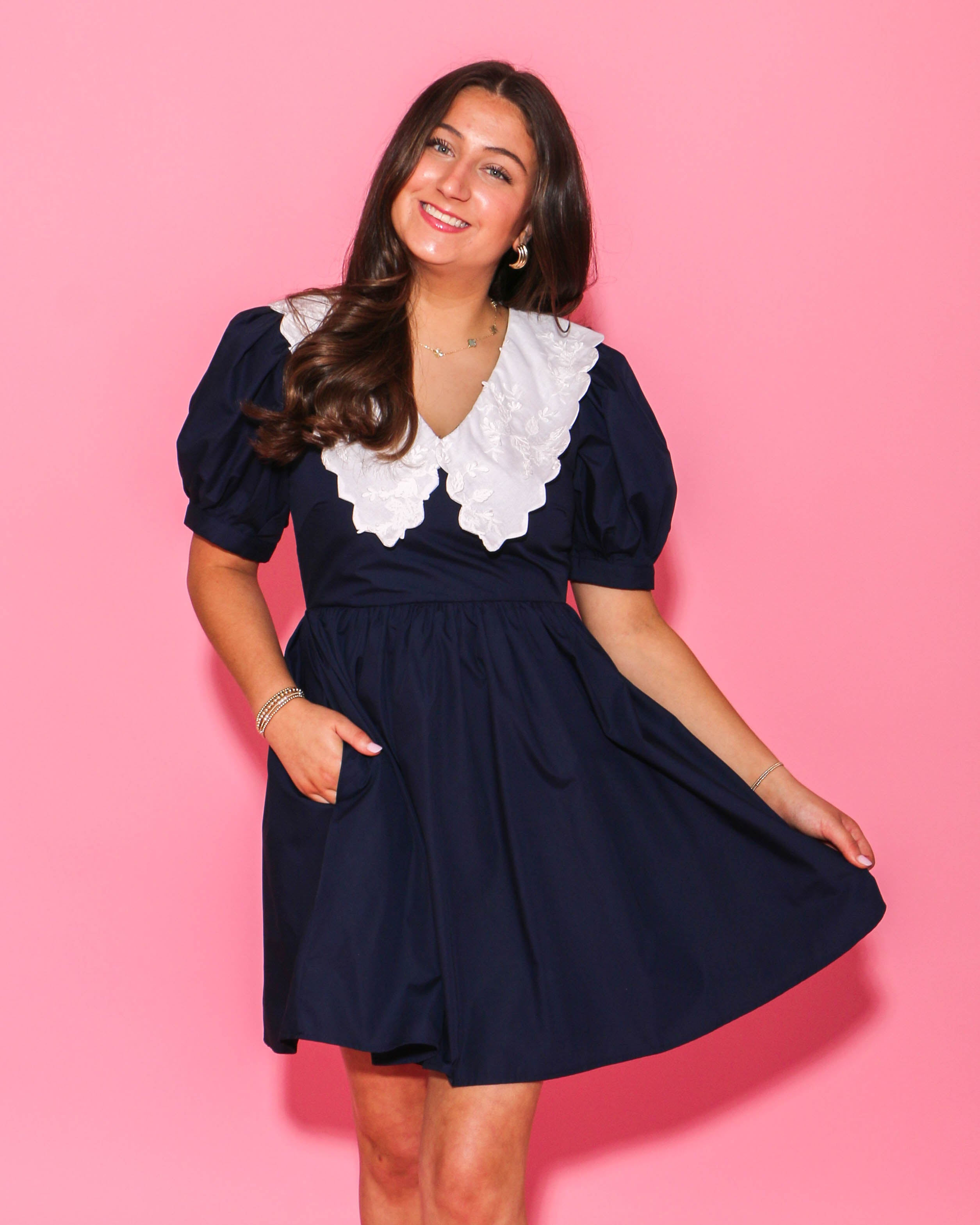 Elevate your style with this stunning navy blue dress featuring a delicate white embroidered collar. The perfect mix of elegance and sophistication, this dress is perfect for any occasion. Stand out in a sea of plain dresses and make a bold statement with this unique and eye-catching piece.