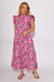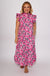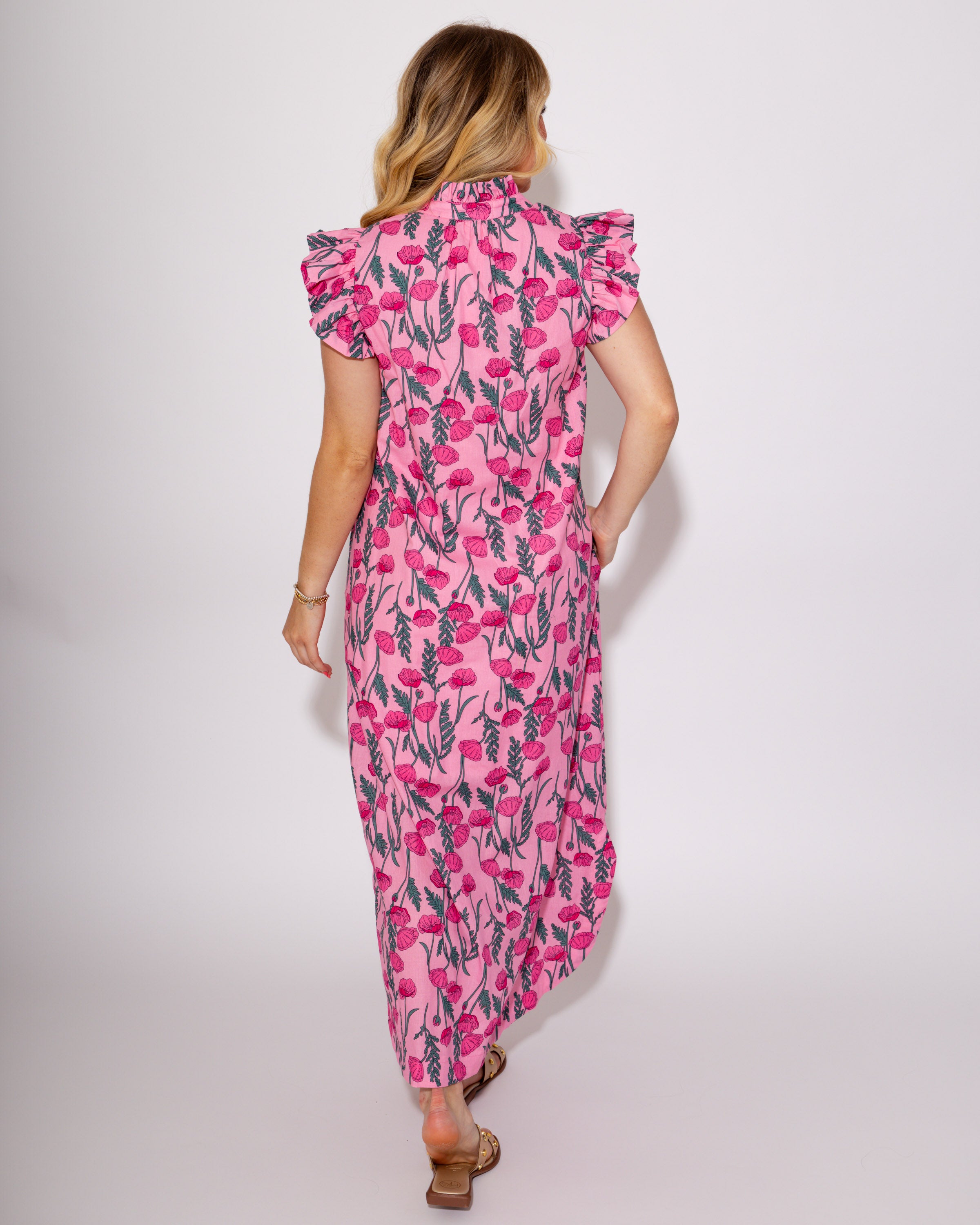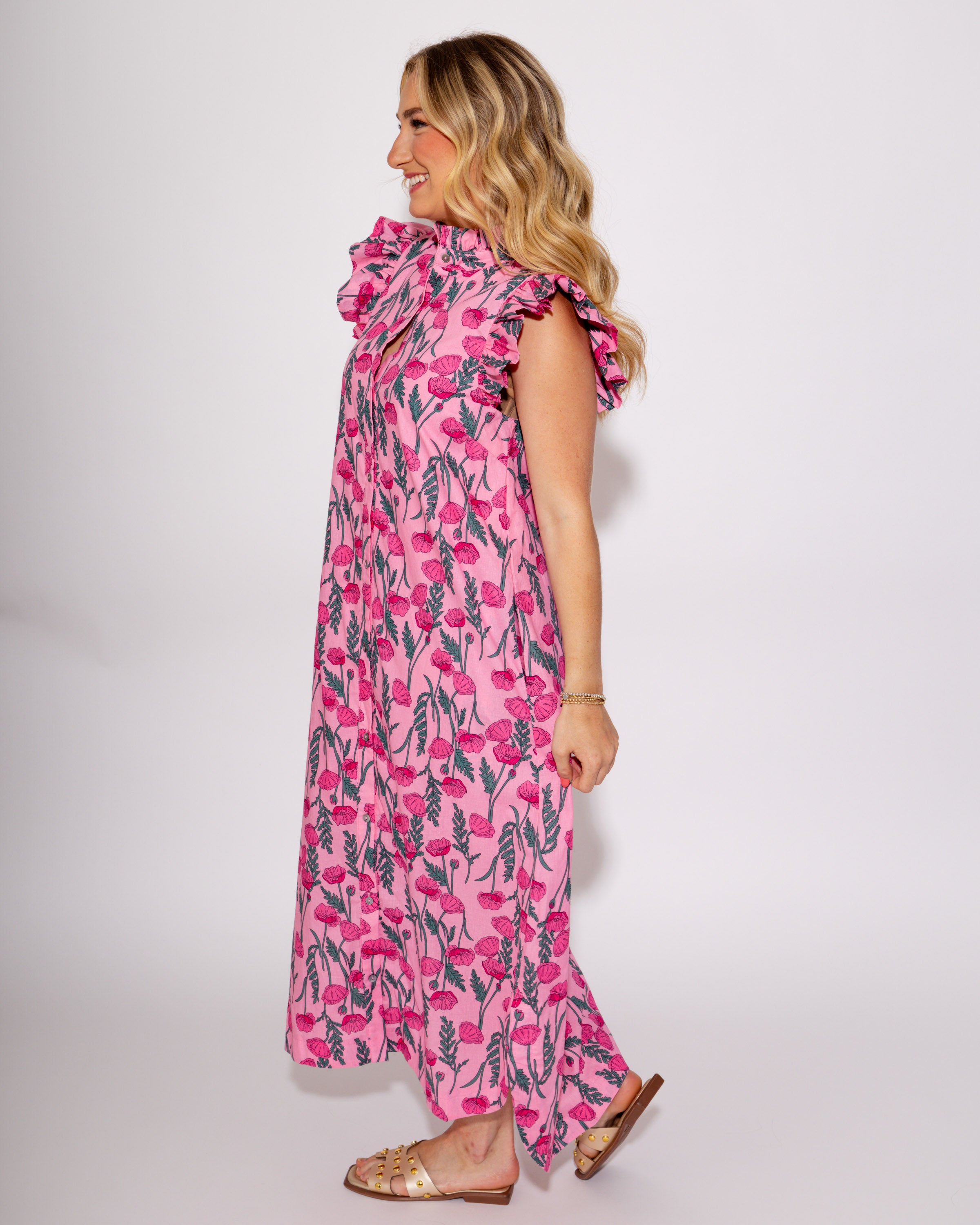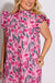 Soft, romantic, and full of charm—this midi dress features a blooming floral print in varying shades of pink. Delicate ruffle flutter sleeves and a ruffled neckline add graceful movement and texture, while the button down closure and collared neckline bring a touch of structure. Finished with convenient side pockets, it’s the perfect piece for weddings, brunch, or any day you want to feel effortlessly lovely.