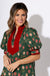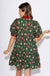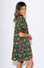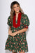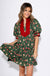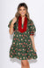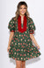 Feminine and effortlessly chic—this floral mini dress is made for easy style. Featuring short puff sleeves with cuff band detail, a ruffle hemline, and a bold caftan-inspired V-neck band in contrasting tones, it blends playful charm with flattering design. The green background with orange tone red floral print and red neckline make it perfect for hot fall weather. Finished with side pockets and a lightweight lined woven fabric, it’s your new throw-on-and-go favorite.